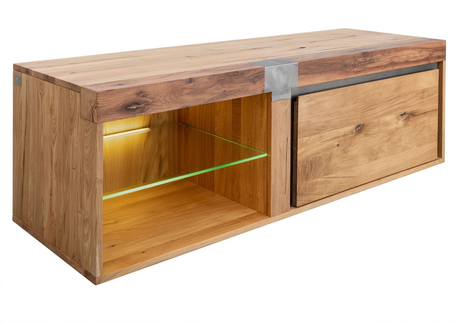 Gemeinsam mit dem geradlinigen Design aus der Feder von Erik Quicker unterstreicht dies das industrielle Flair des TV-Lowboards aus Massivholz. Besonderer Eyecatcher: Der solide Holzbalken, der den Blick auf den oberen Abschluss des Möbels lenkt.