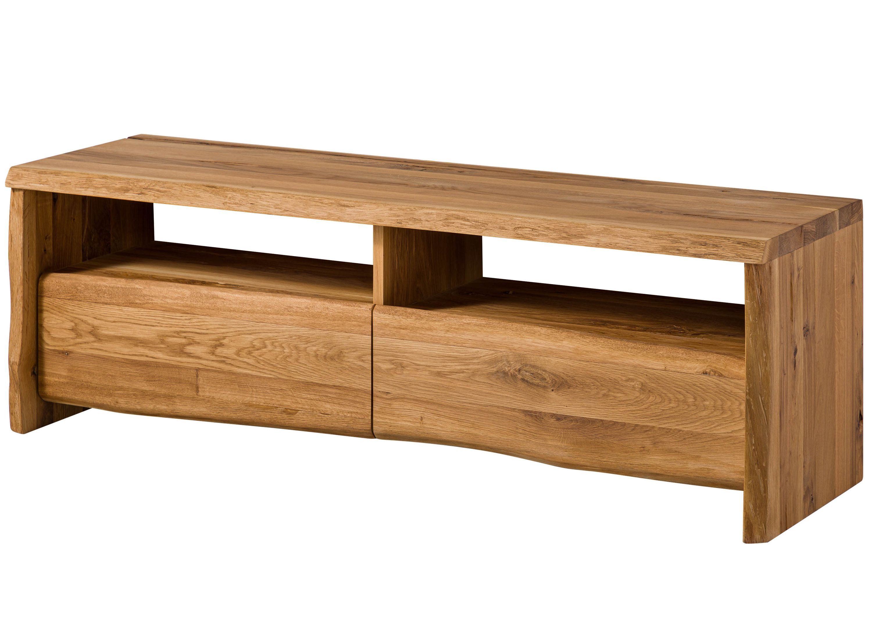 Platz für und um den Fernseher bietet dieses TV-Board der PURE OAK Serie. Doch eigentlich lenkt das geölte Fernsehmöbel aus Wildeiche alle Blicke auf sich. Denn das TV-Rack ist durch die individuelle Maserung des Eichenholzes ein echter Eyecatcher. Hinter der grifflosen Front des Lowboards verbergen sich zudem zwei Schubladen und zwei offene Fächer, in denen Fernbedienung, Receiver oder DVDs ihren Ort finden.