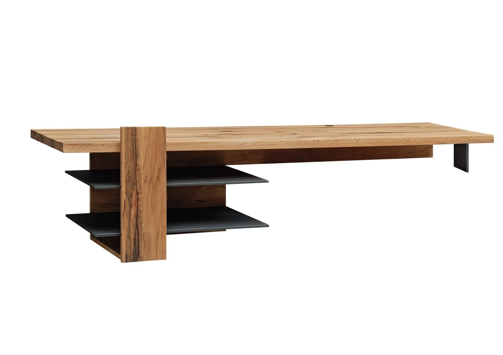 Dieses TV-Regal aus der Serie FRANKFURT lässt sich mit allen TV-Schränken der Kollektion kombinieren. Wie bei den anderen Möbelstücken hebt Designer Erik Quicker auch hier das hochwertige Naturmaterial hervor. Die frontal angebrachte Platte aus Zerr- und Wildeiche betont die spezielle Optik der Eichenhölzer. Zwei Einlegeböden aus kratzfestem Laminat in dezentem Grauton unterstreichen den städtischen Charakter der Möbelkollektion.