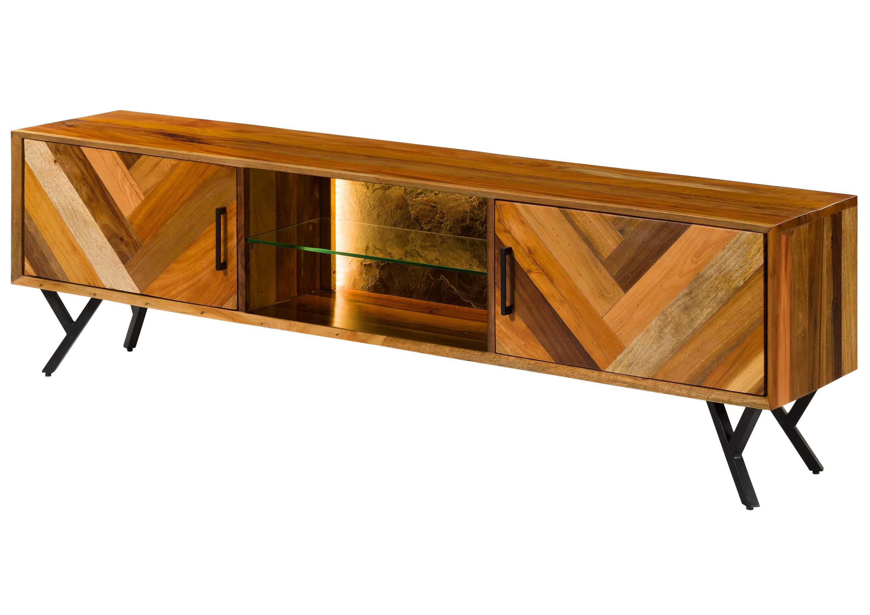 Ein Eyecatcher durch und durch: Dieses TV-Board glänzt mit einem Mix aus verschiedenen Naturmaterialien. Massives Altholz bildet den Korpus und zeigt sich im faszinierenden Fischgrät-Muster. Dazu kommt eine Rückwand aus hochwertigem Steinfurnier – stilvoll beleuchtet dank integrierter LEDs. Griffe und ausgestellte Metallfüße in Schwarz sorgen als dunkler Ruhepol für optische Balance – und perfektionieren das Mid-Century Flair.