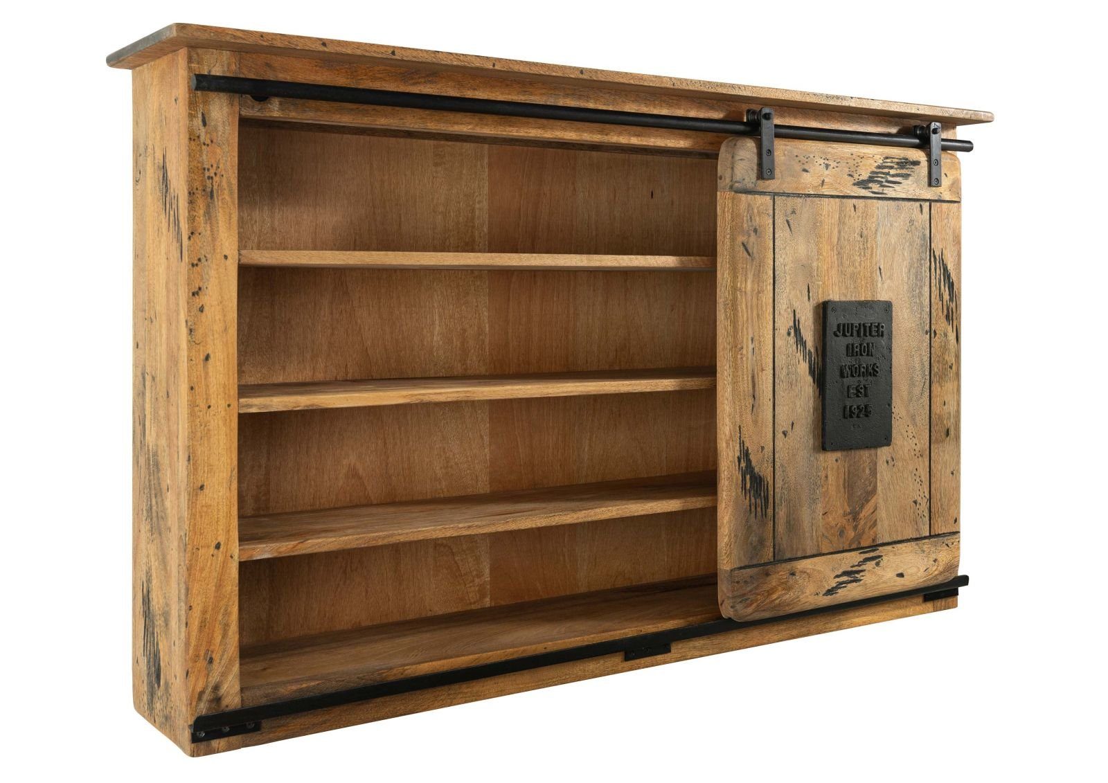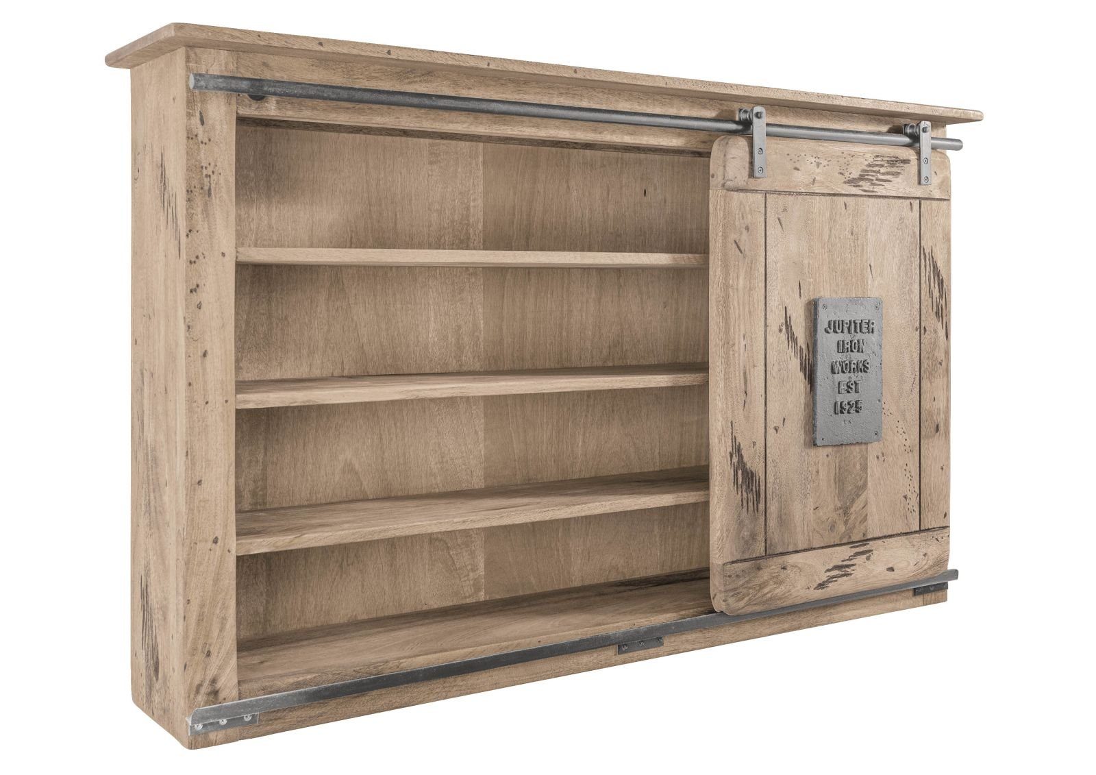 Bei diesem Hängeregal aus Mango Holz gehen Industrial Style und Vintage Chic eine hervorragende Symbiose ein. Das Wandregal überzeugt mit einem aufregenden Materialmix aus Massivholz und Metall. Das besondere Designdetail dieses Möbelstücks stellt die Schiebetüre dar. Sie kann über die gesamte Breite des Regals hin- und herbewegt werden und nimmt somit Einfluss auf die Optik dieses Möbelstücks.