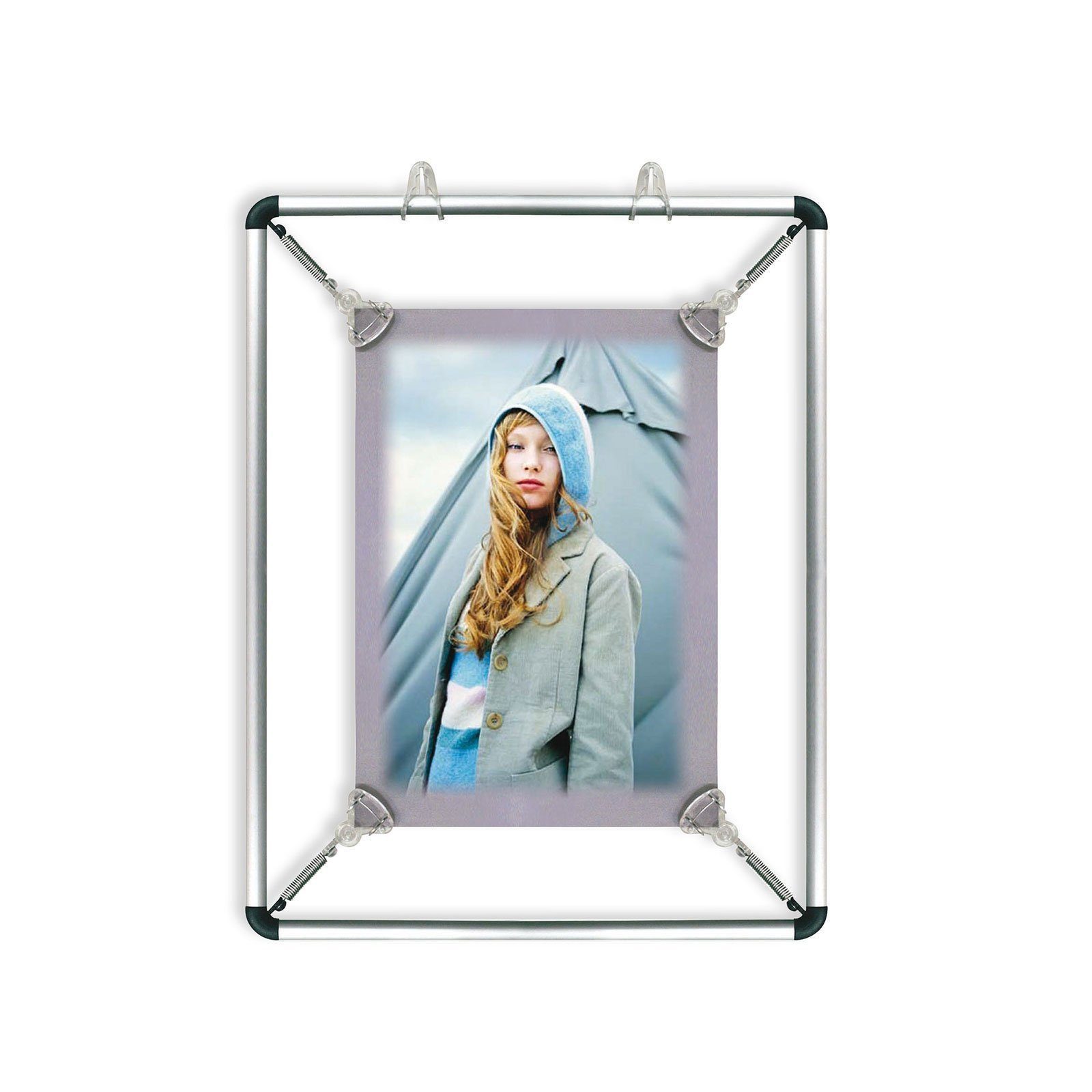 Der Spannrahmen besitzt vier Federzug-Halter, an welchen das Poster befestigt wird. Der Rahmen selbst besteht aus silbereloxiertem Aluminium und verleiht dem Posterhalter seine Eleganz. Der Alurahmen kann mit zwei Aufhängern an der Wand oder an der Decke befestigt werden.