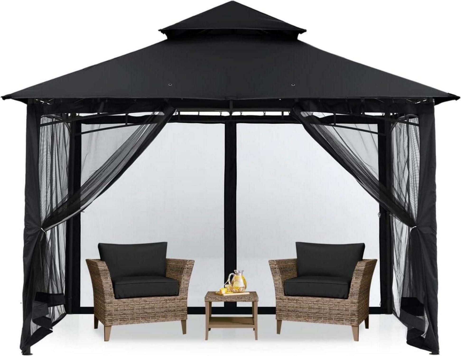 Das durchdachte Design des Pavillons umfasst ein belüftetes Dach für eine gute Luftzirkulation, 8 Abflusslöcher, um Wasseransammlungen zu verhindern und 4 elegante Netzwände, die sich leicht öffnen und schließen lassen. Die verdickten Fußstangen gewährleisten Sicherheit und Stabilität, während der am Rahmen befestigte Haken perfekt zum Aufhängen von Dekorationen geeignet ist.