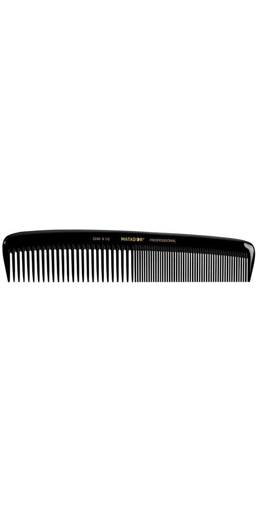 Matador Damenkamm 2246/8,5 Schwarz 21,6 cm Der Matador Damenkamm 2246/8,5 schwarz 21,6 cm ist unentbehrlich für jeden Profi, aber auch für Endverbraucher geeignet. Der Damenkamm ist leicht und flexibel und eignet sich ideal zum Schneiden der Haare und zum Kreieren verschiedener Frisuren. Der Damenkamm hat eine Seite mit gröberen Zinken und eine Seite mit schmaleren Zinken, die vielseitig eingesetzt werden können. Das erleichtert die Arbeit im Friseursalon. Der Kamm ist antistatisch und hat abgerundete Spitzen aus 100 % Ebonit. So kann der Kamm leicht durch das Haar gleiten. Der Matador Damenkamm 2246/8,5 schwarz 21,6cm ist hitze- und chemikalienbeständig. Merkmale: * Sehr leicht * 2 Seiten * Damenkamm Gebrauchsanweisung Sowohl bei trockenem als auch bei nassem Haar durchkämmen. Seien Sie jedoch vorsichtig, denn das Kämmen durch nasses Haar kann dazu führen, dass es schneller bricht. Um eine gute Hygiene zu gewährleisten, ist es wichtig, den Kamm regelmäßig zu reinigen.