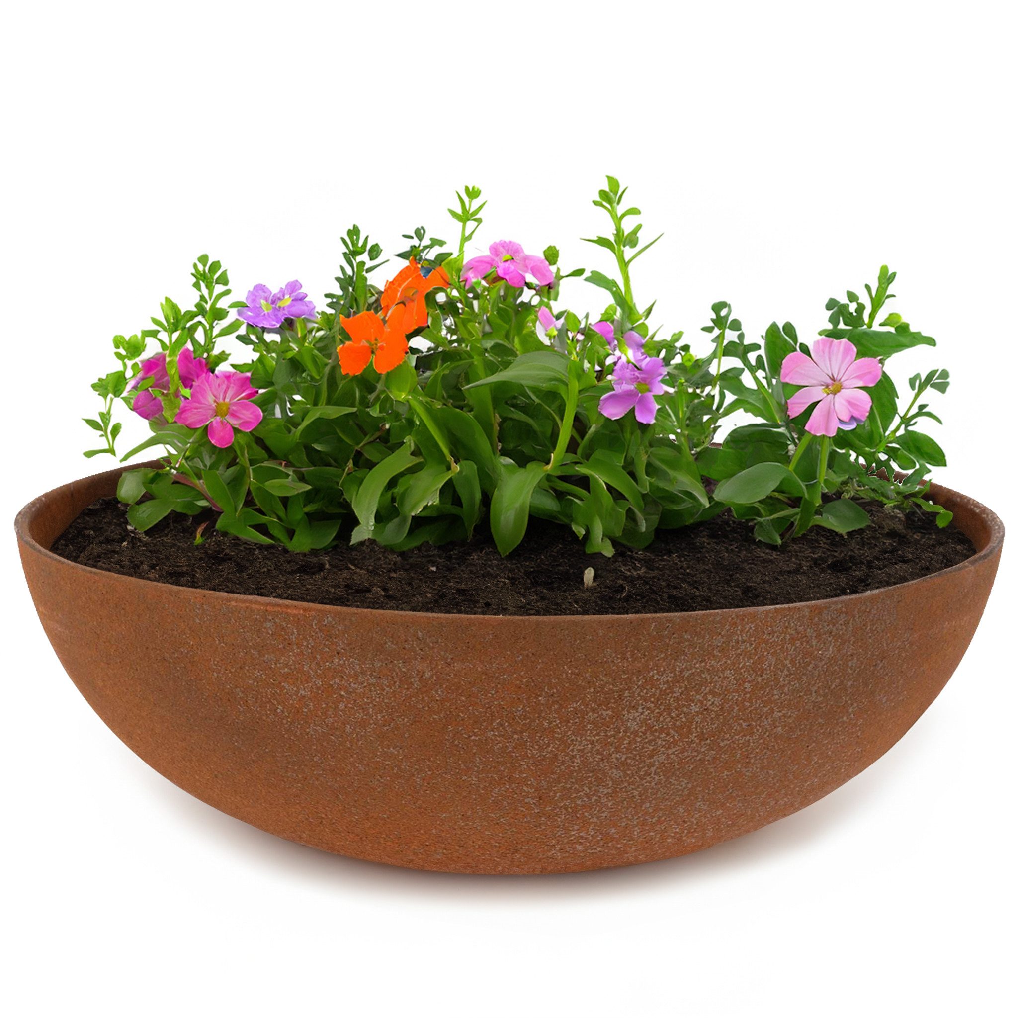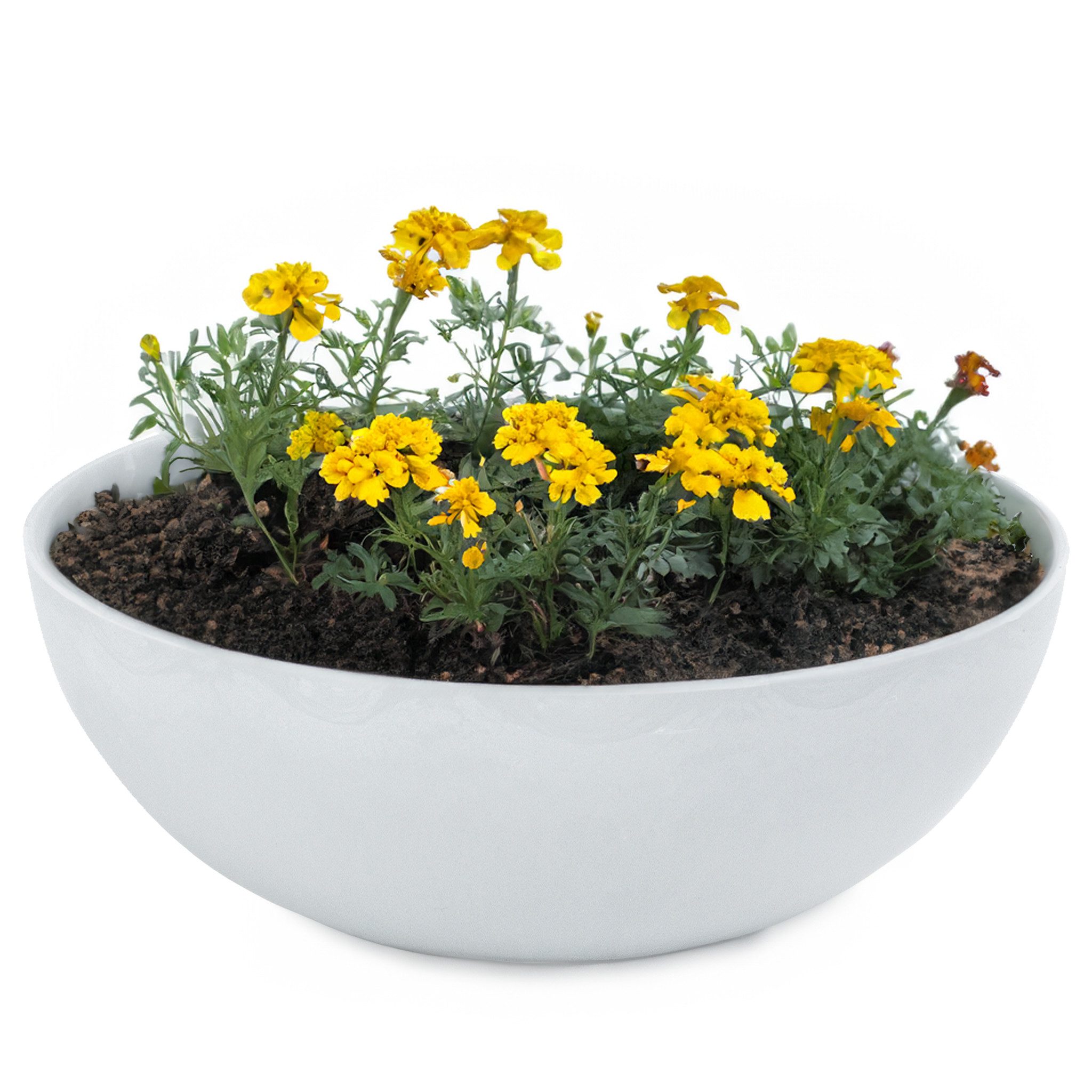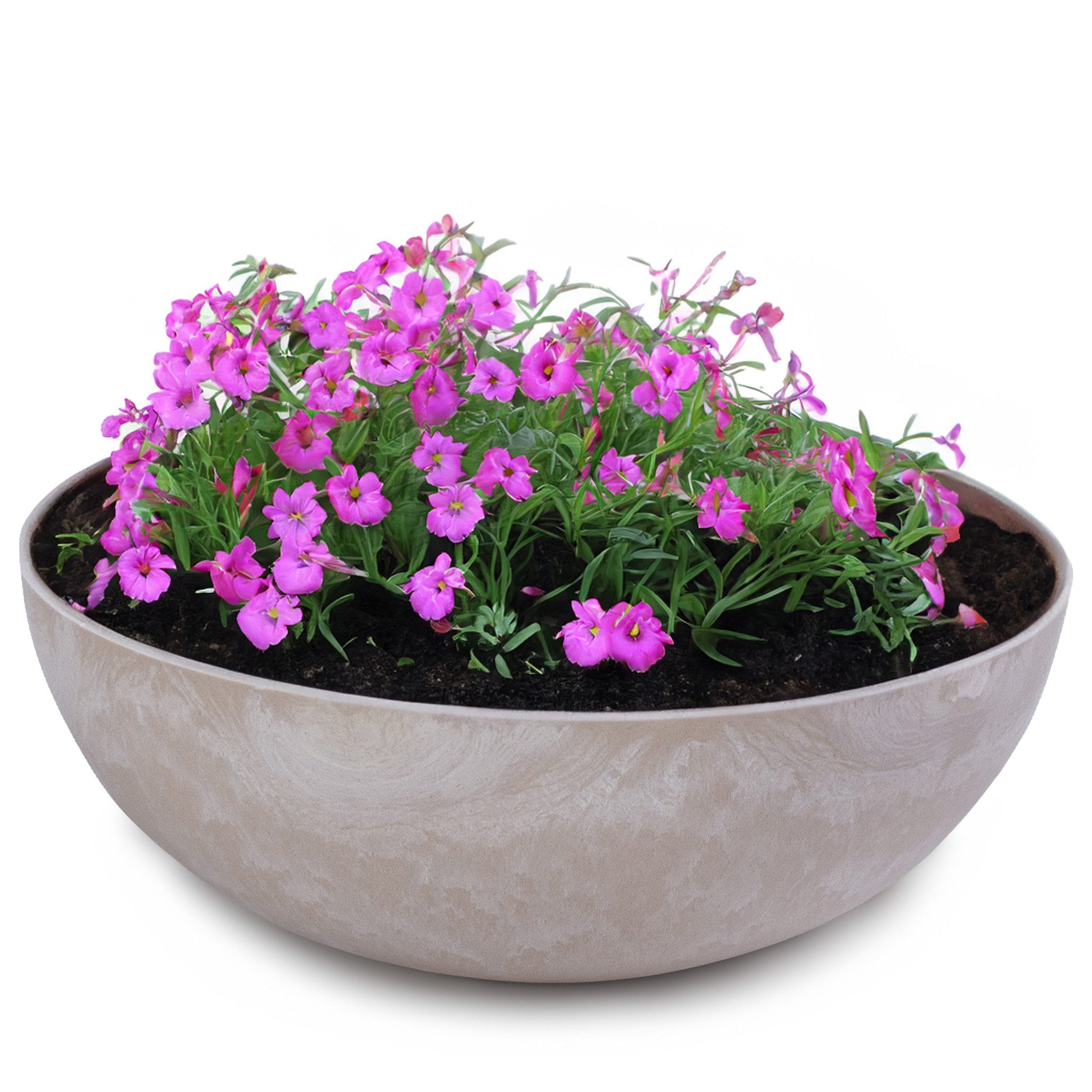 Runde Pflanzschalen aus widerstandsfähigem Kunststoff im bauchigen Design für innen und outdoor