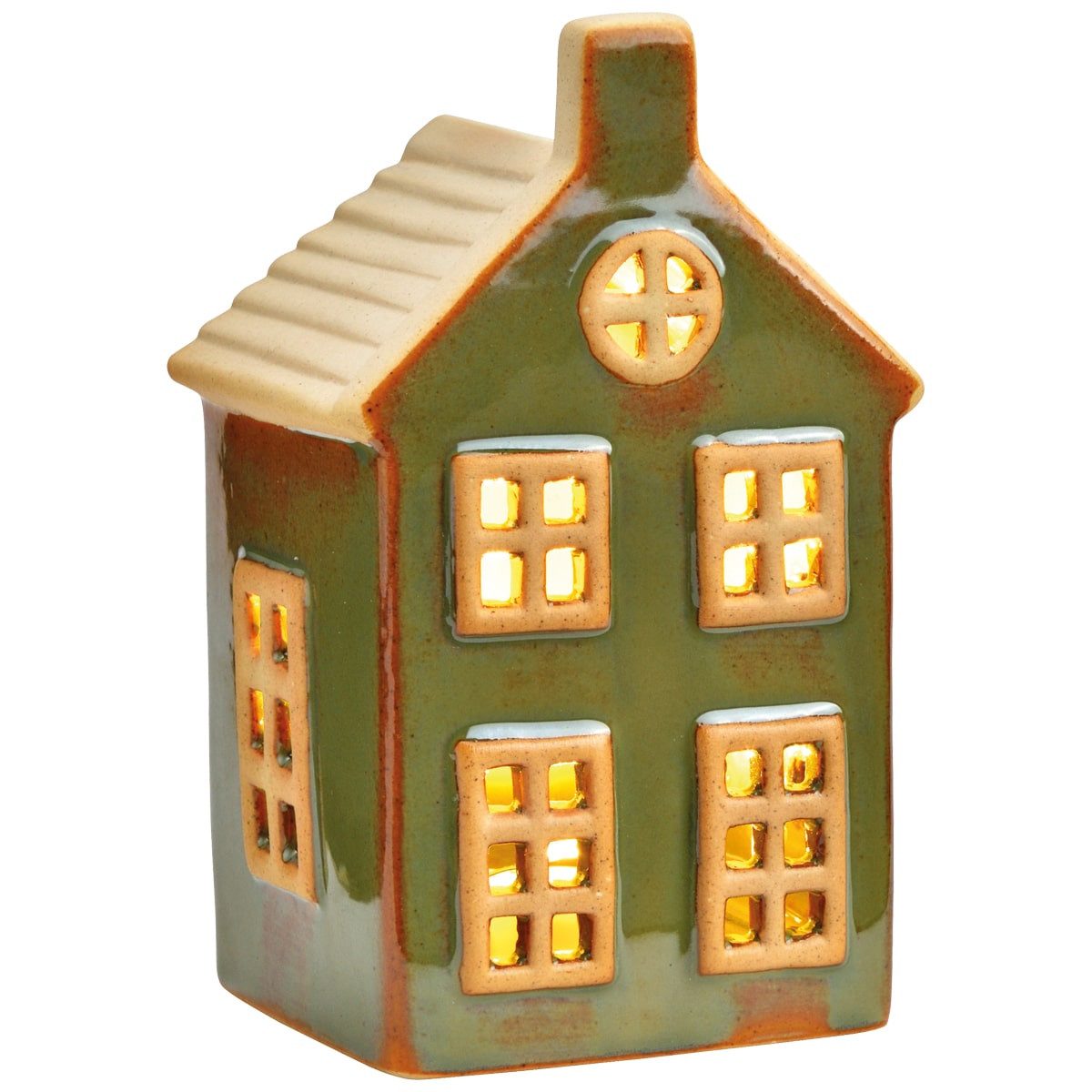 Keramikhaus mit LED – Festliche Beleuchtung in zwei Größen Bringe zauberhafte Weihnachtsstimmung in dein Zuhause mit diesem wunderschönen Keramikhaus in Grün. Die warmen LED-Lichter, die sanft durch die Fenster strahlen, schaffen eine behagliche Atmosphäre und machen dein Zuhause zu einem festlichen Winterwunderland. Wähle zwischen zwei Größen, um die perfekte Ergänzung für deine Weihnachtsdekoration zu finden. Verfügbare Größen: - **Kleine Размер (6x11x6 cm):** Ideal für kleinere Dekorationen auf dem Tisch oder der Fensterbank, batteriebetrieben mit 2XAG13-Batterien (nicht enthalten). - **Große Размер (8x16x6 cm):** Perfekt als auffälliger Hingucker in deiner weihnachtlichen Deko-Landschaft, batteriebetrieben mit 3xAG13-Batterien (nicht enthalten). Stimmungsvolles LED-Licht Das warme Licht bringt eine sanfte, festliche Beleuchtung in jeden Raum. Ob im Wohnzimmer, Esszimmer oder auf der Fensterbank – dieses Keramikhaus zaubert im Nu eine gemütliche Weihnachtsatmosphäre. Hinweis Die benötigten Batterien (2XAG13 für das kleine und 3XAG13 für das große Haus) sind nicht im Lieferumfang enthalten. Größe Erhältlich in 6x11x6 cm und 8x16x6 cm Material und Farbe Material: Keramik Farben: Grün