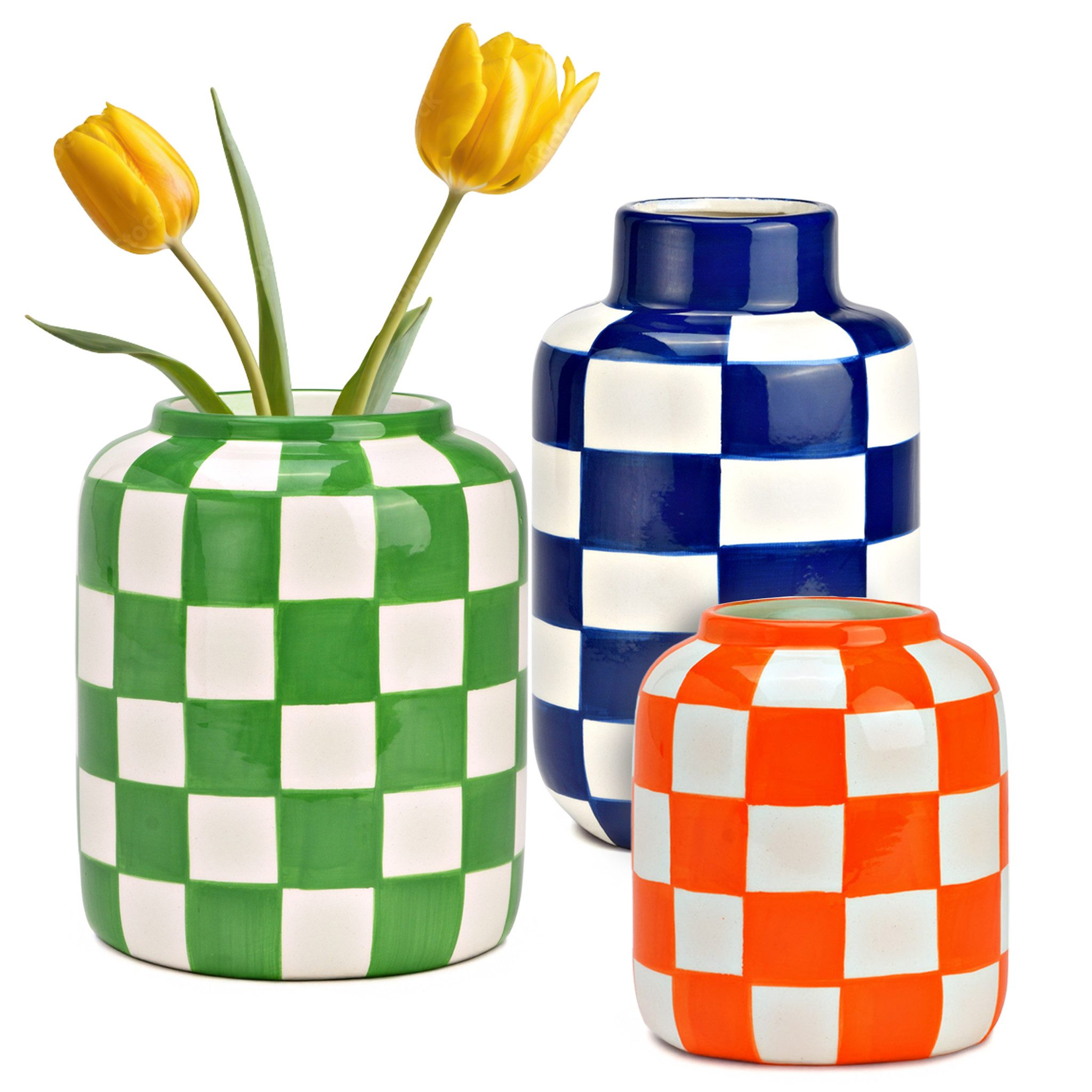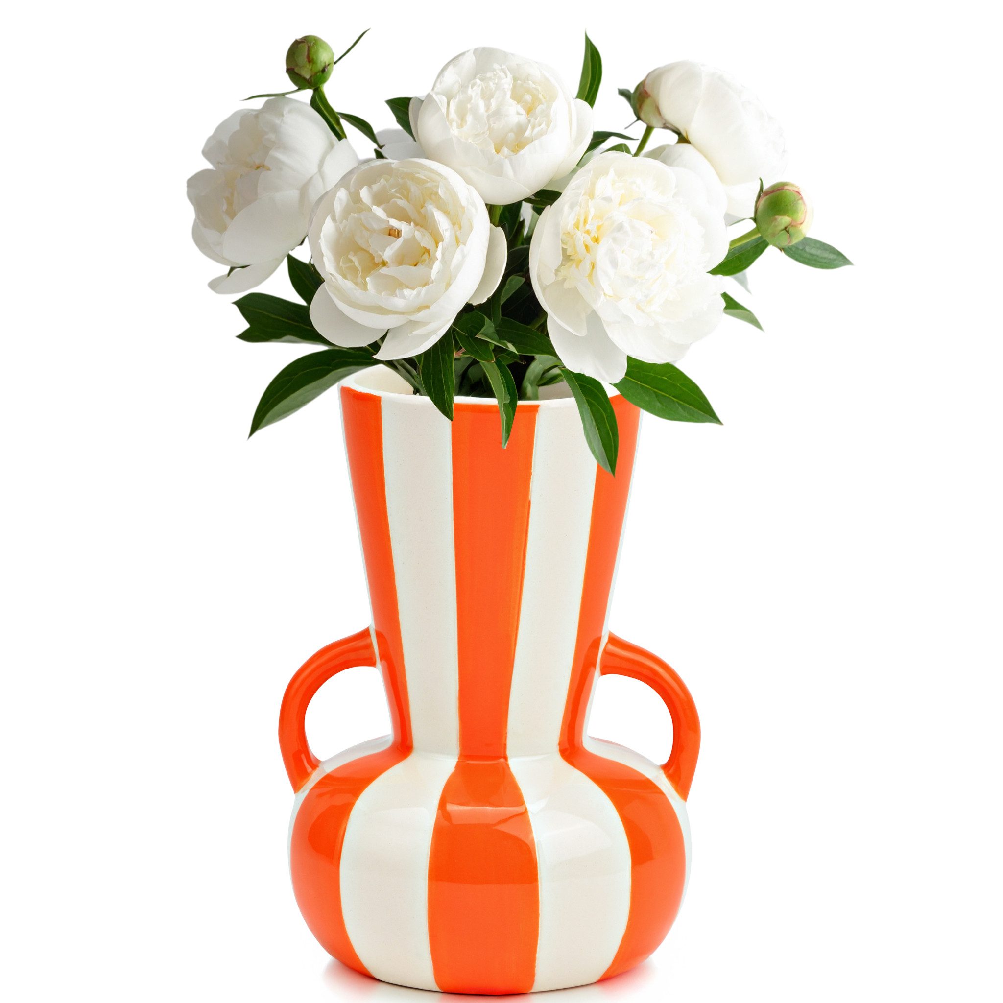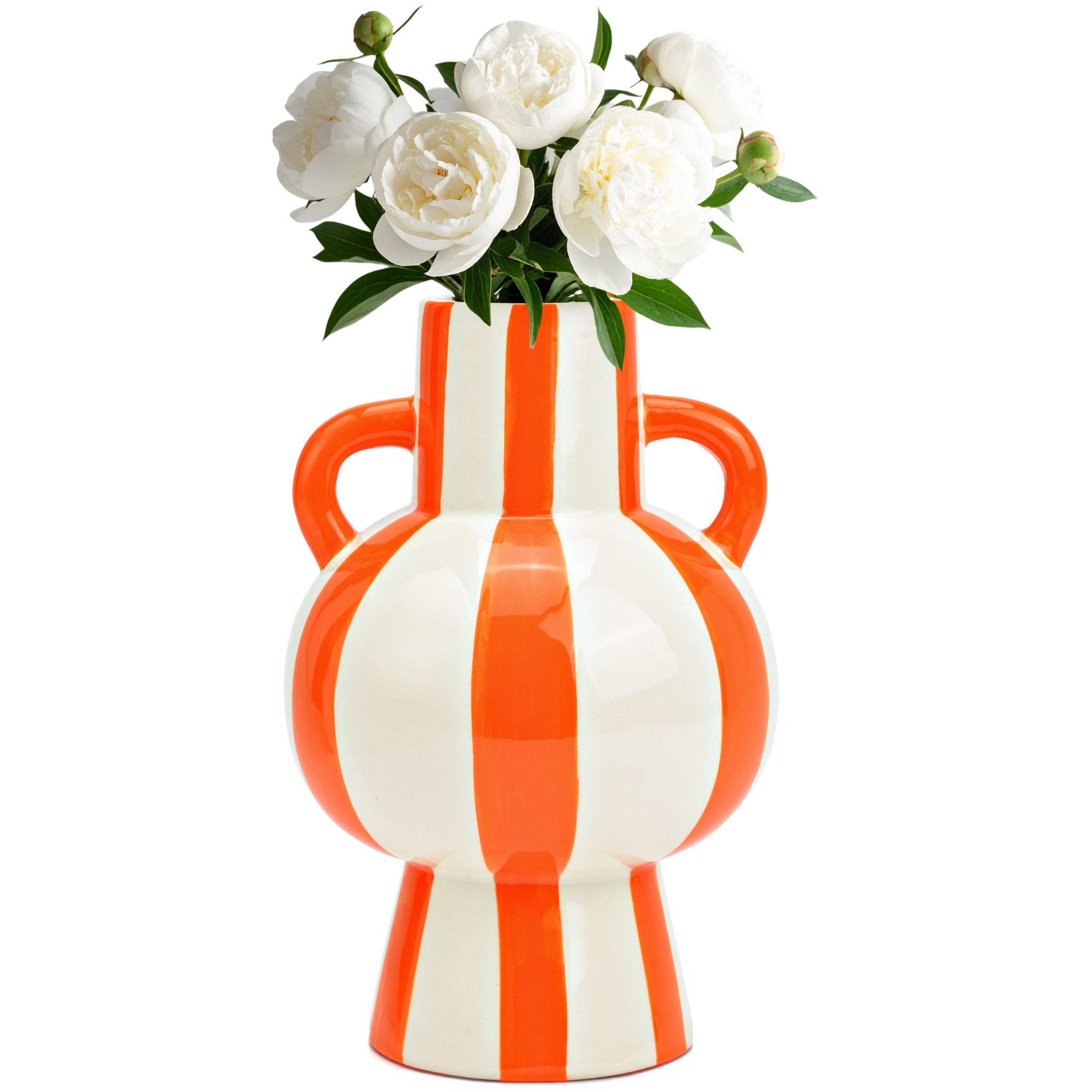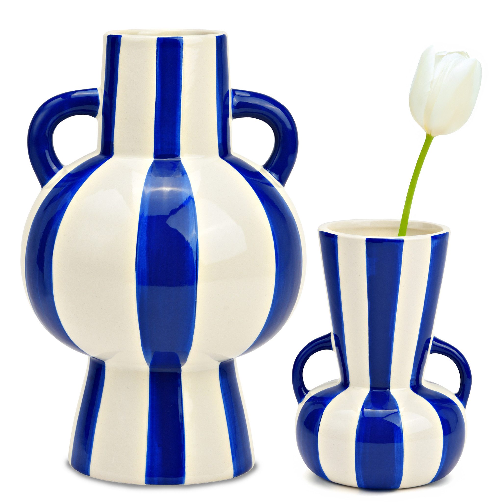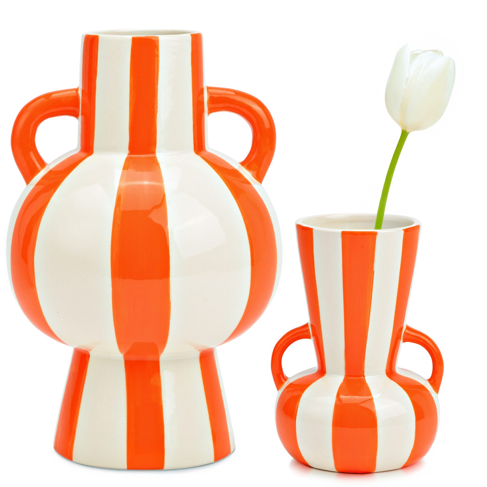 Gestreifte Keramik-Vase - Ein Kunstwerk für deine DekorationDiese wunderschöne Blumenvase aus hochwertiger Keramik besticht durch ihr einzigartiges gestreiftes Design und ihre leuchtenden Farben. Mit ihrer harmonischen Form und den eleganten Griffen ist sie ein echtes Highlight in jeder Einrichtung.Perfekt für jede Jahreszeit und WohnstilOb als Tischvase oder Bodenvase - diese Dekovase sorgt das ganze Jahr über für stilvolle Akzente. Sie eignet sich hervorragend für Blumenarrangements wie Tulpen, Rosen oder Trockenblumen, kann aber auch solo als kunstvolles Deko-Element stehen.Farben & Größen für deine individuelle GestaltungUnsere gestreifte Keramik-Vase ist in verschiedenen Farben und Größen erhältlich, damit sie perfekt zu deinem Wohnstil passt:Gelb/Weiß - 15 x 24 x 15 cm (B/H/T)Gelb/Weiß - 11 x 16 x 11 cm (B/H/T)Orange/Weiß - 15 x 24 x 15 cm (B/H/T)Orange/Weiß - 11 x 16 x 11 cm (B/H/T)Blau/Weiß - 15 x 24 x 15 cm (B/H/T)Blau/Weiß - 11 x 16 x 11 cm (B/H/T)Material & FarbeMaterial: KeramikFarben: Gestreift in Gelb/Weiß, Orange/Weiß oder Blau/Weiß