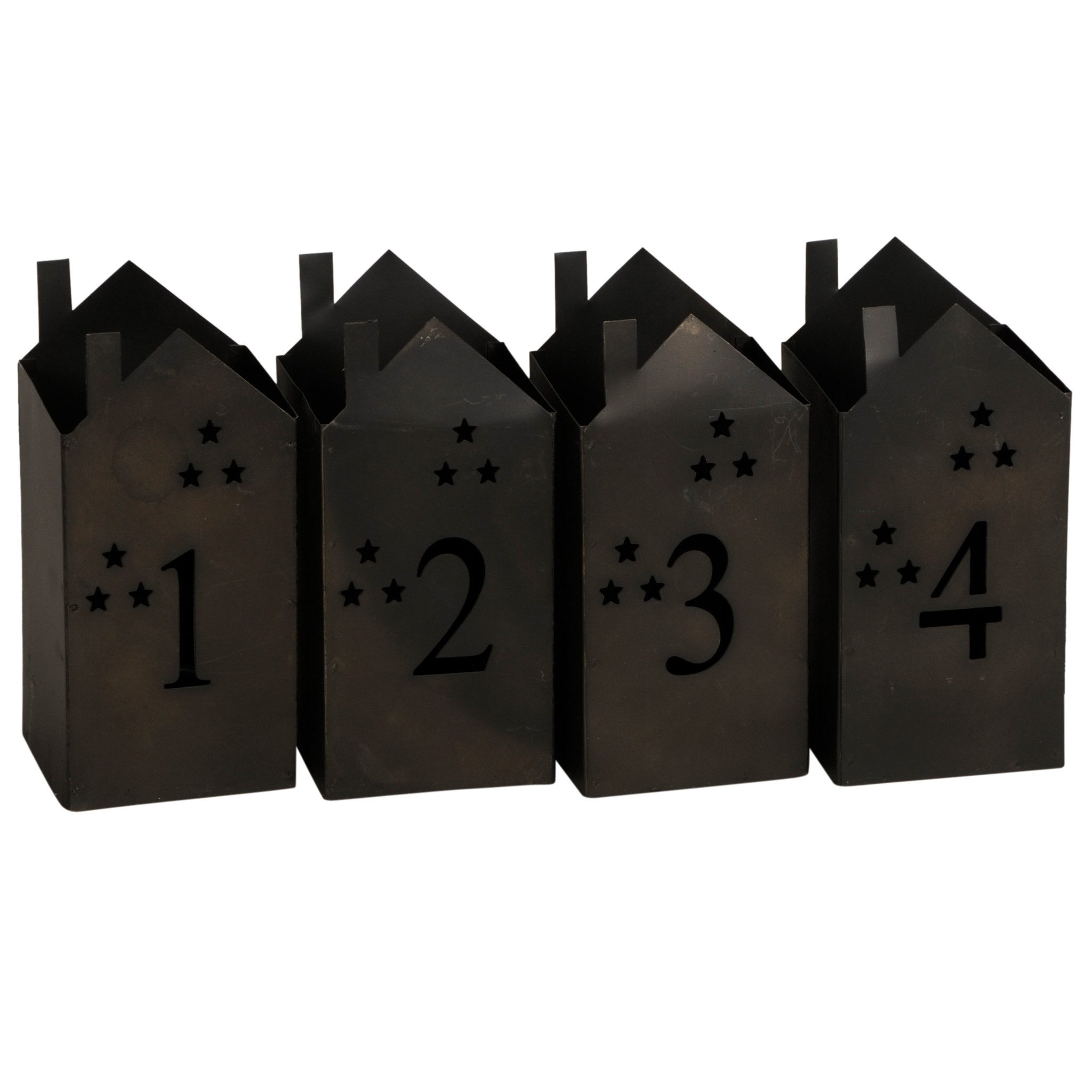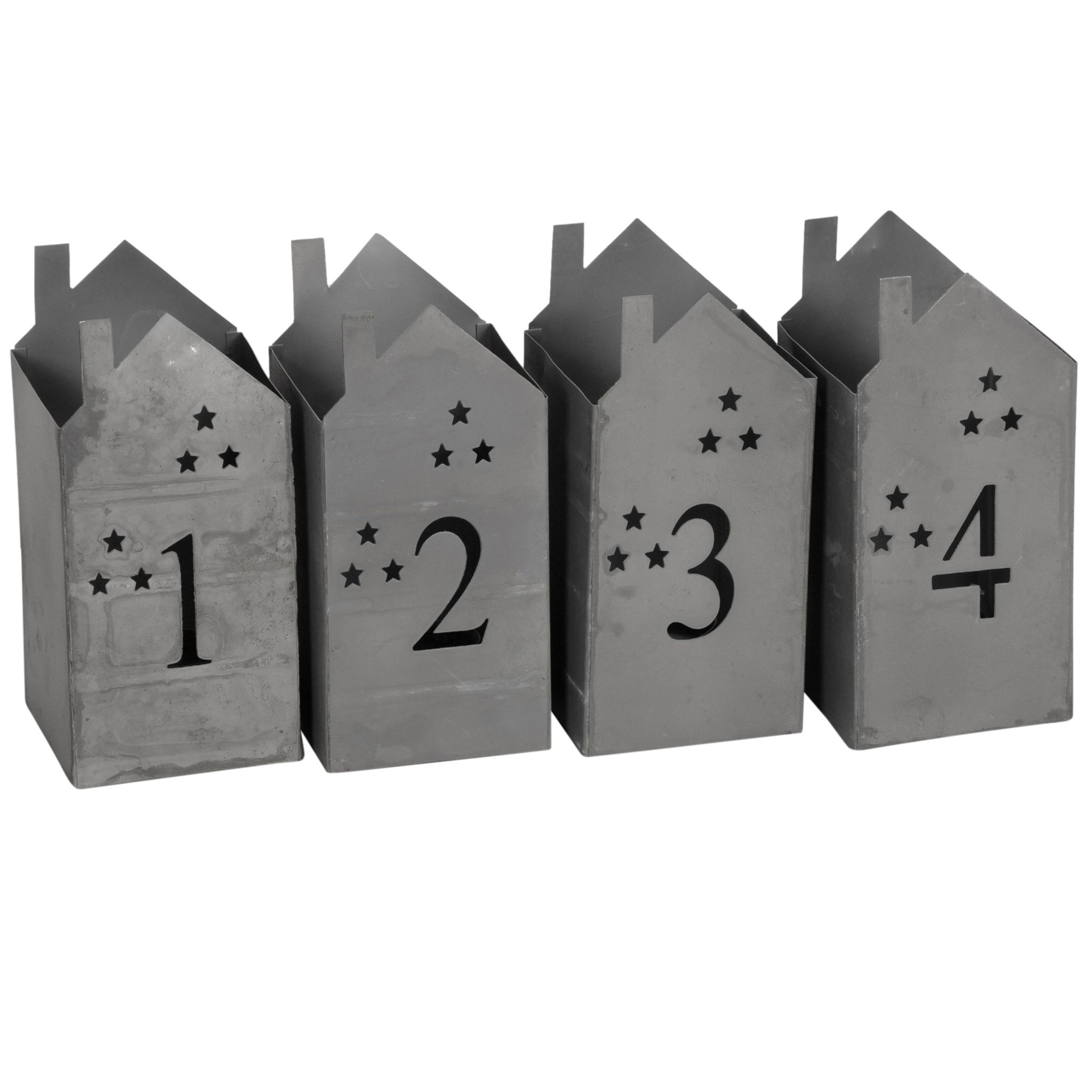 Advents-Windlichter im Hausdesign - stilvoll, vielseitig, stimmungsvoll.Dieses liebevoll gestaltete 4er-Set besteht aus Windlichtern in Hausform, nummeriert von 1 bis 4 - perfekt als moderner Adventskranz oder winterliches Dekoelement. Die Windlichter bestehen aus robustem Eisen, sind hochwertig verarbeitet und bringen mit ihrer schlichten Eleganz eine warme, festliche Atmosphäre in Dein Zuhause.Für jede Deko der passende Look - erhältlich in drei stilvollen Farben.Ob skandinavisch-schlicht, rustikal oder modern - diese Kerzenhalter passen sich Deiner Weihnachtswelt perfekt an. Du kannst zwischen drei stilvollen Farben wählen:Schwarz für einen edlen, minimalistischen Look, Weiß für eine helle, nordische Winterwelt und Zinkgrau für eine natürliche, zeitlose Optik. So findest Du genau das Set, das ideal zu Deinem Adventskranz, Weihnachtsdorf oder zur festlichen Fensterbank-Deko passt.Stimmungsvoll kombinierbar für Dein persönliches Weihnachtswunderland.Platziere die Häuser auf dem Tisch mit Tannenzweigen und Kerzen für ein individuelles Adventsgesteck oder kombiniere sie mit Lichterketten im Fenster. Sie lassen sich auch wunderbar mit anderer weißer Adventsdeko oder Holz-Elementen kombinieren.Размер je Windlicht: 7,5 x 8,5 x 16 cmMaterial und Farbe: Aus Eisen gefertigt - erhältlich in Schwarz, Weiß oder Zinkgrau - mit ausgestanzten Sternen und den Zahlen 1 bis 4