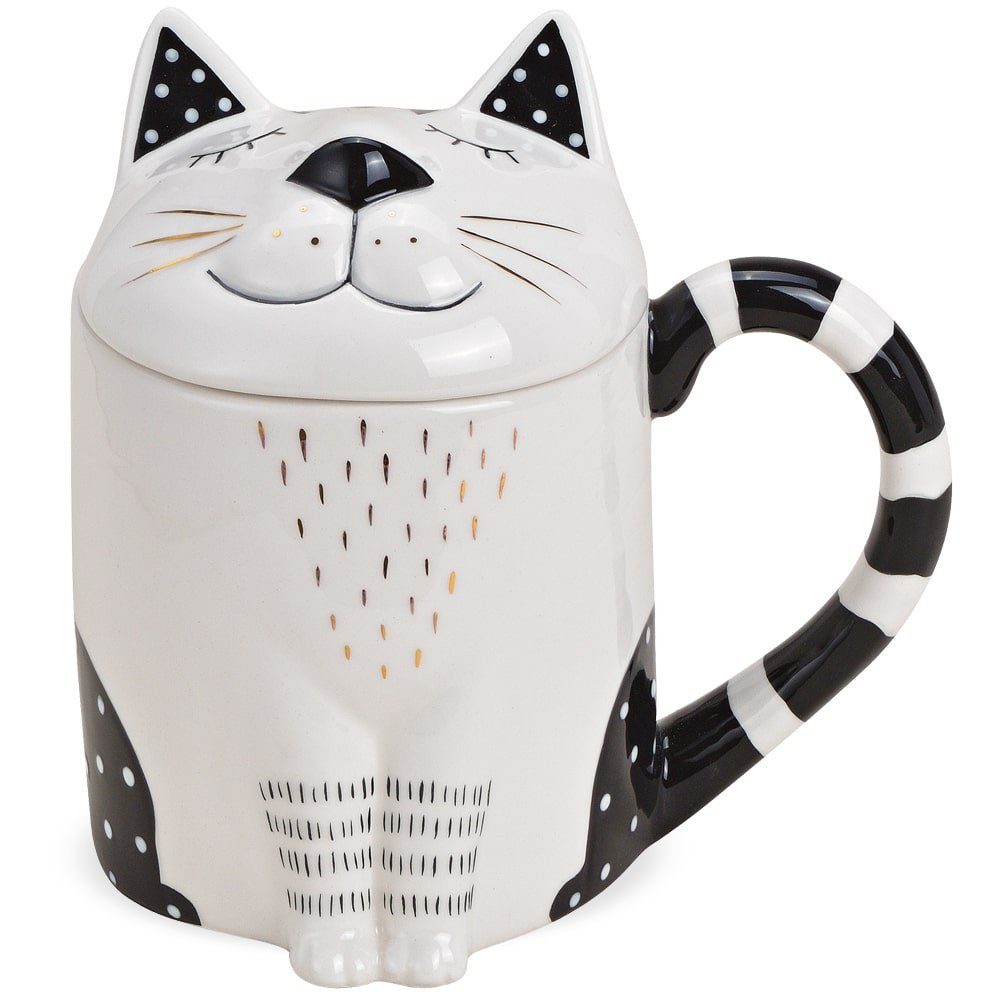 matches21 Kaffeetasse Teetasse Katze mit Deckel Katzentasse Dose Becher Keramik weiß schwarz & gold 1 Stk 14x14x10 cm