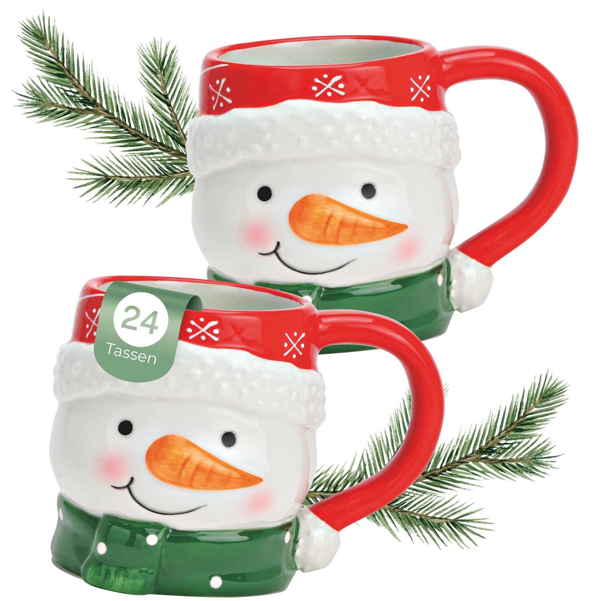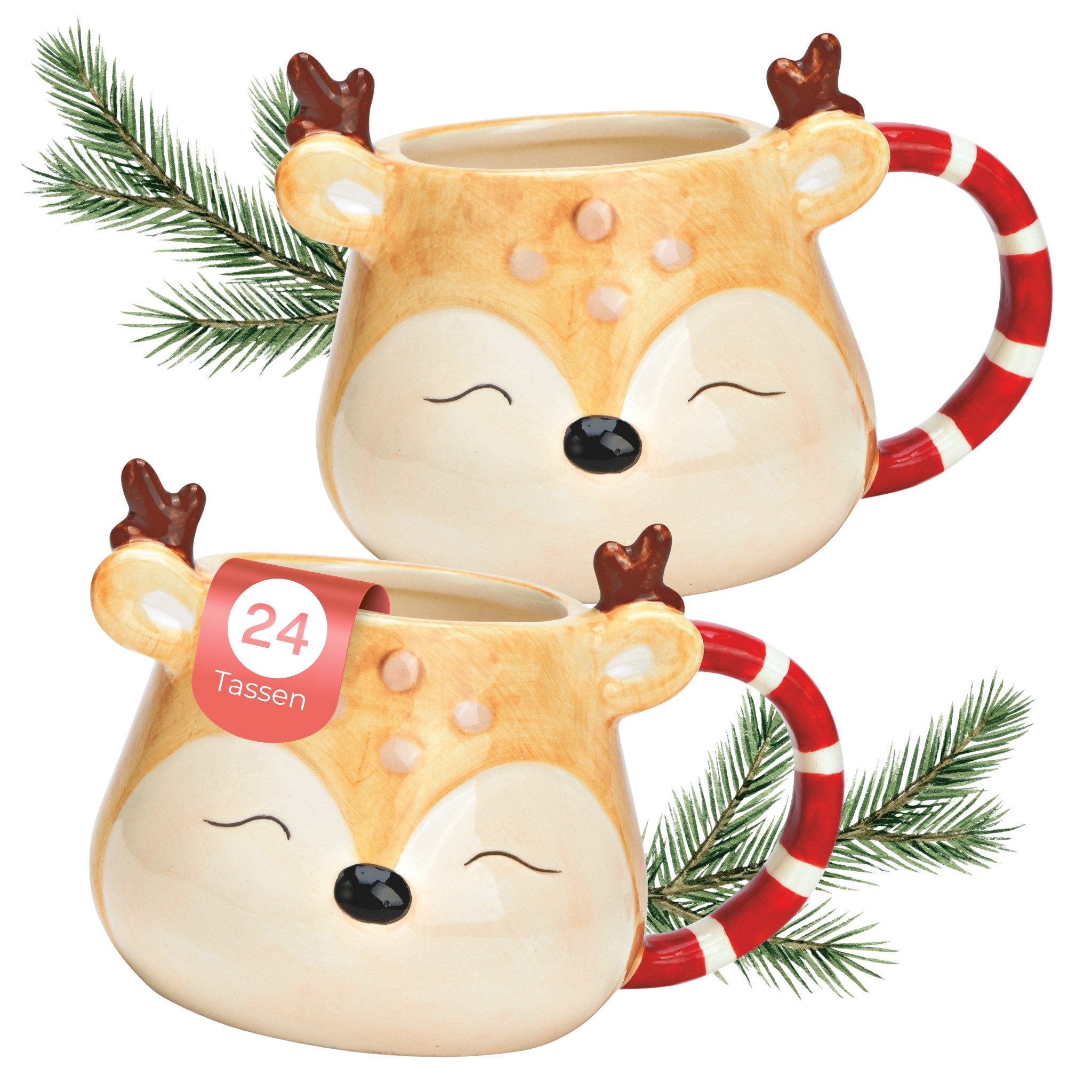 Größen & Füllmengen - Nikolaus Becher: 15 x 10 x 9 cm - ca. 400 ml - Schneemann Becher: 14 x 10 x 8 cm - ca. 370 ml - Rentier Becher (klassisch): 14 x 10 x 11 cm - ca. 360 ml - Rentier Becher (neu, mit Schal & roter Mütze): 16 x 10 x 9 cm - ca. 380 ml