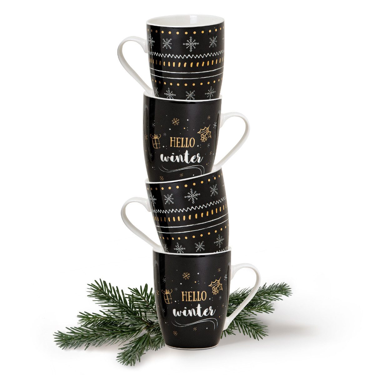 matches21 Tassen Kaffeetassen Weihnachtstassen Porzellan Hello Winter Weihnachten schwarz weiß gold 48 Stk. / Karton