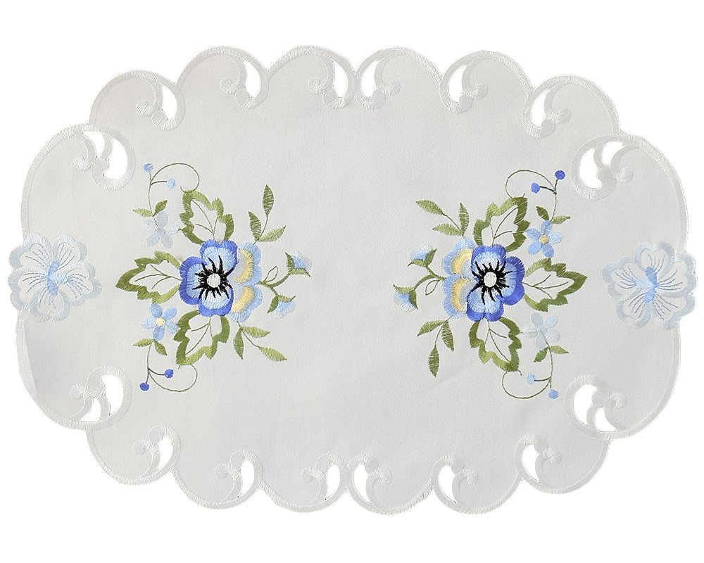 ZAUBERHAFTE STICKEREI - Wunderschönes ovales Deckchen mit filigraner Blütenstickerei blau & Cutwork-Rand - perfekte Tischdeko für Esstisch, Kommode oder als edles Wohn-Accessoire.