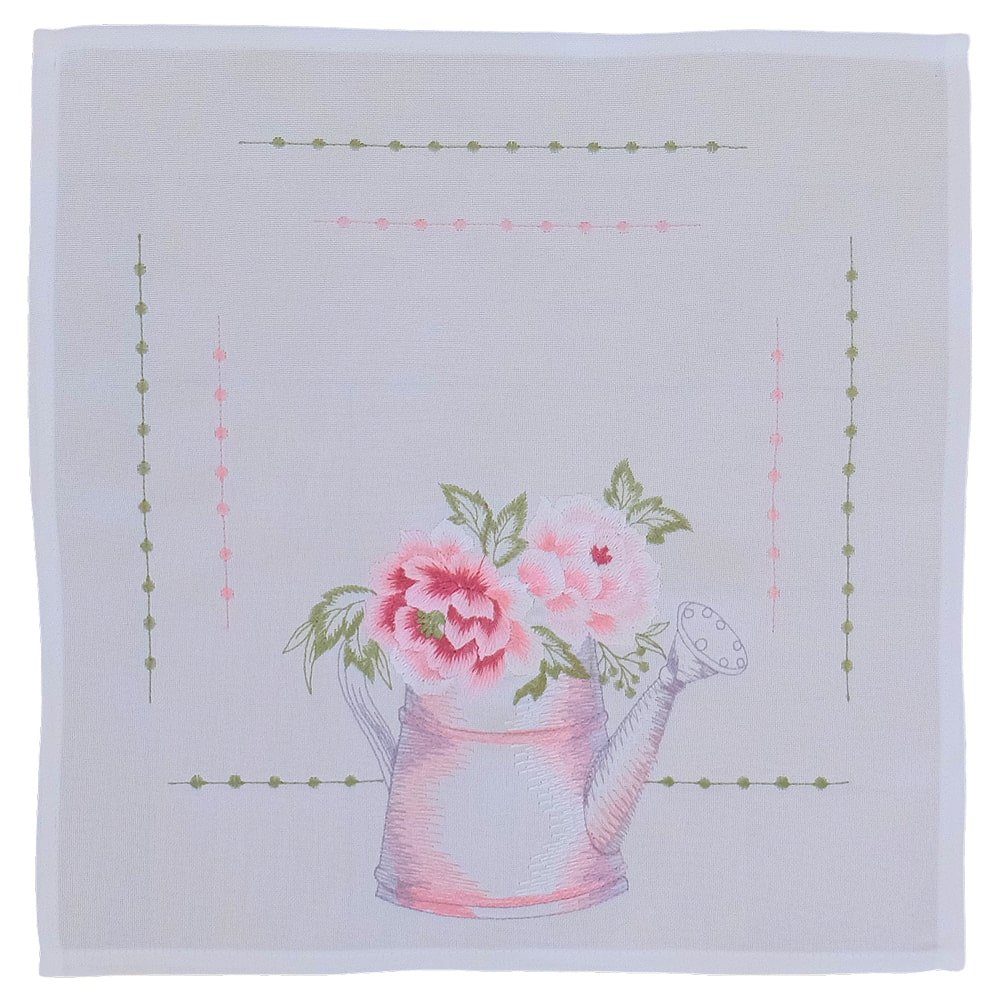 FILIGRANE STICKEREI - Deckchen mit wunderschönen Blumenranken in einer Gießkanne - eine stilvolle Tischdeko für Esstisch, Kommode oder als liebevolles Wohn-Accessoire.