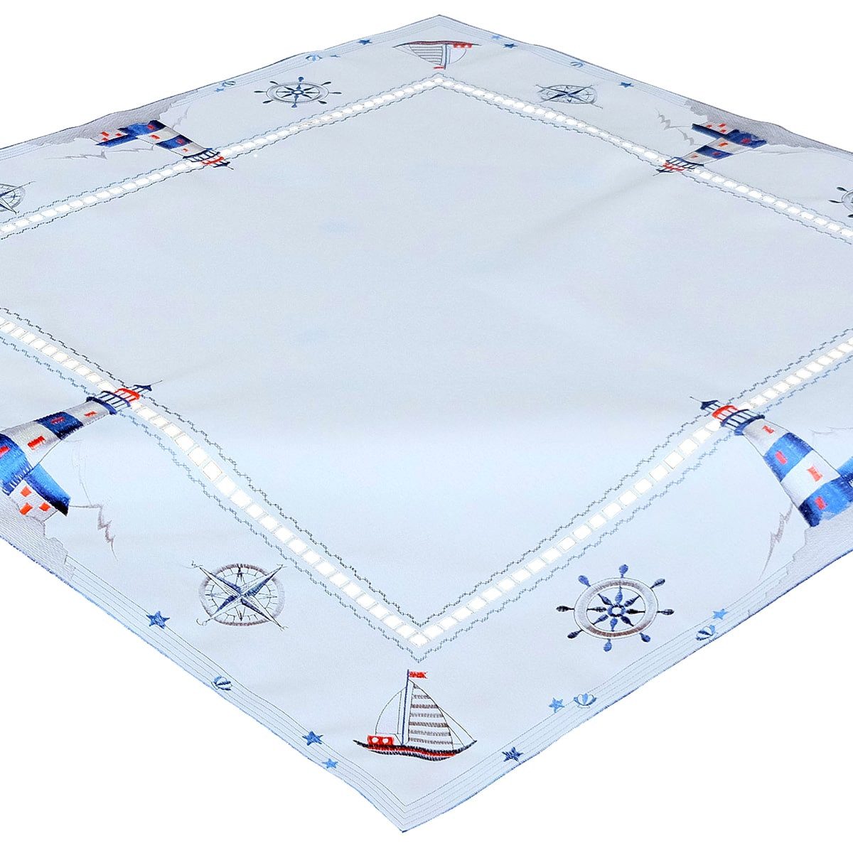 MARITIMES DESIGN – Stilvolle Tischdecke VERENA 85x85 cm mit detailreicher Stickerei aus Leuchttürmen, Segelbooten und nautischen Motiven – perfekt für Küstenliebhaber & maritime