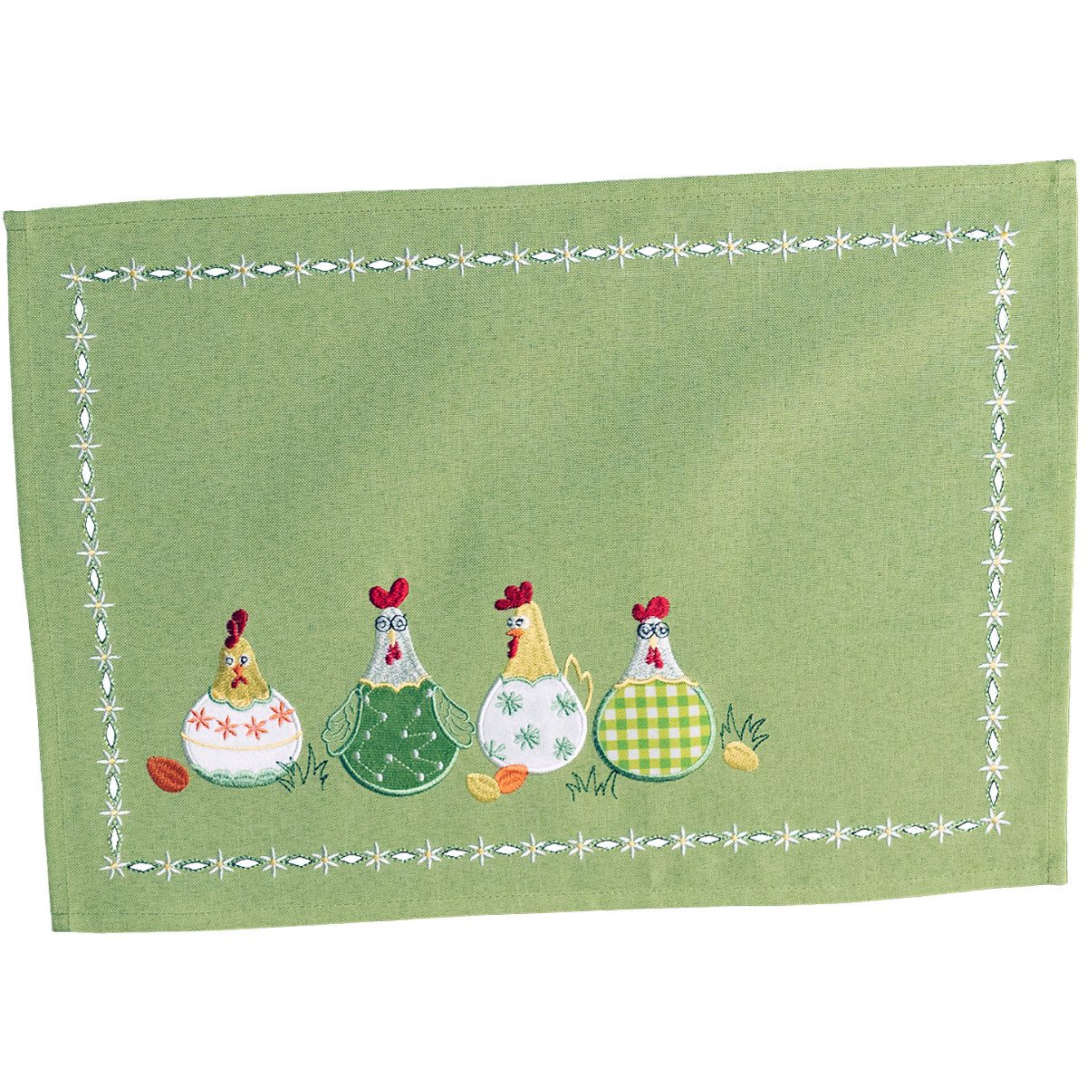 FRÖHLICHE OSTERDEKO – Platzdeckchen TAMI grau 35 x 50 cm mit witzigen applizierten Hühnern und feiner Kurbelstickerei. Perfekt für eine frühlingshafte, verspielte Tischgestaltung.