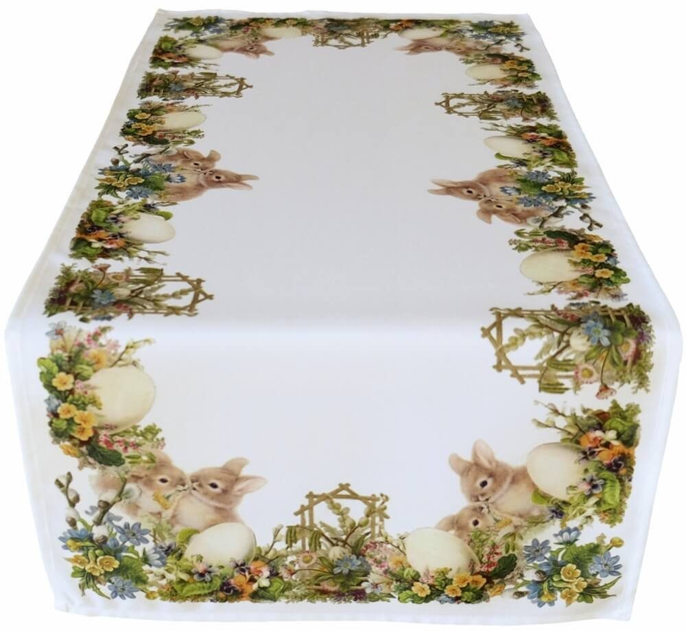 DETAILVERLIEBTER DRUCK – Niedliche Hasen, bunte Blumen & Ostereier zieren die Mitteldecke in harmonischen Farben – ein charmanter Blickfang für jede Osterdekoration.