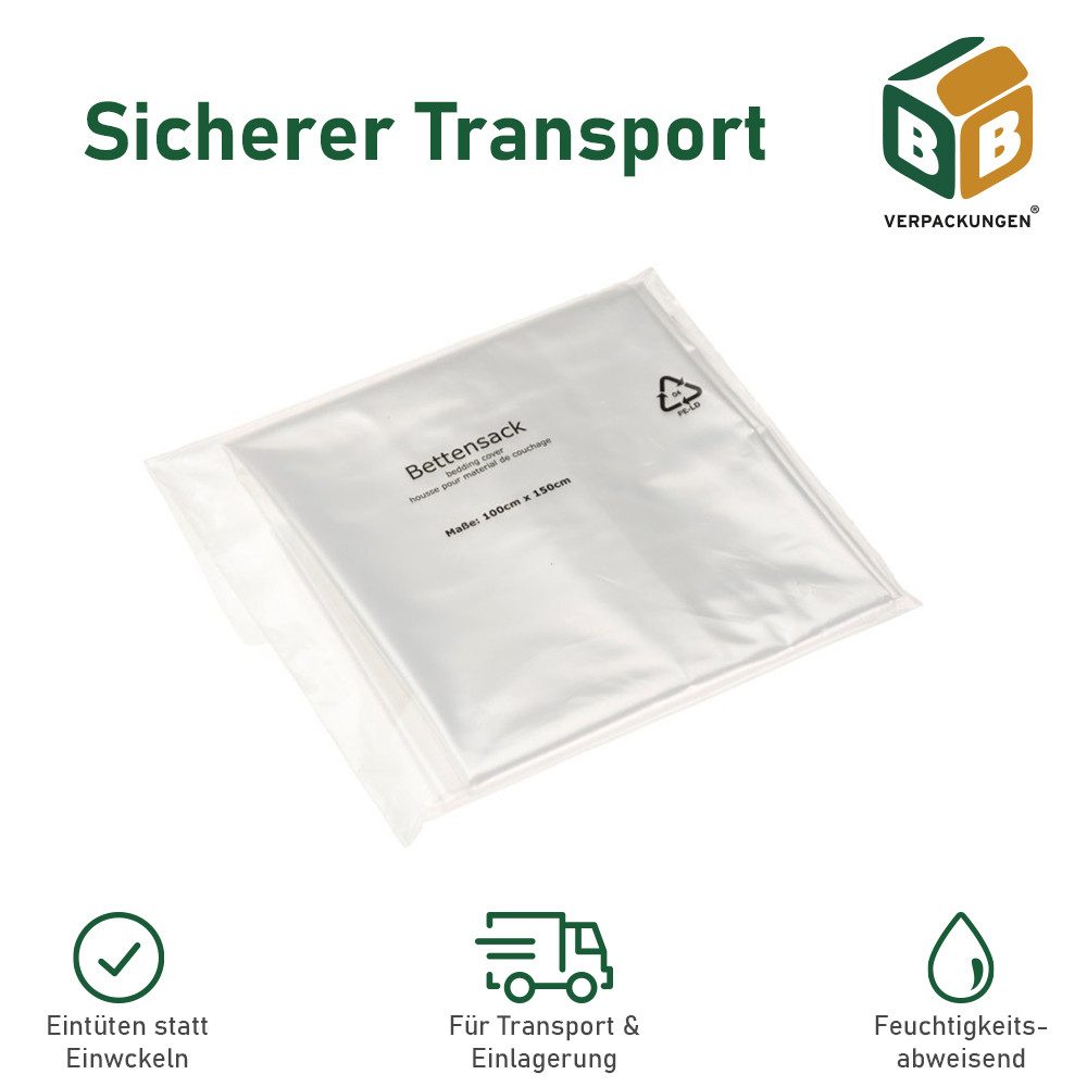 Der Bettensack ist mit einer Folienstärke von 55 my besonders robust und reißfest und schützt Ihr Bettzeug beim Umzug oder bei der Lagerung effektiv vor Staubansammlung, Schmutz und Feuchtigkeit. Das sehr anpassungsfähige Bettzeug wird durch den Bettensack weder in seiner Flexibilität noch in seiner Komprimierbarkeit eingeschränkt und ermöglicht eine unkomplizierte Lagerung. Andere Verpackungslösungen wie Kisten oder Taschen erschweren dies durch ihre Inflexibilität.