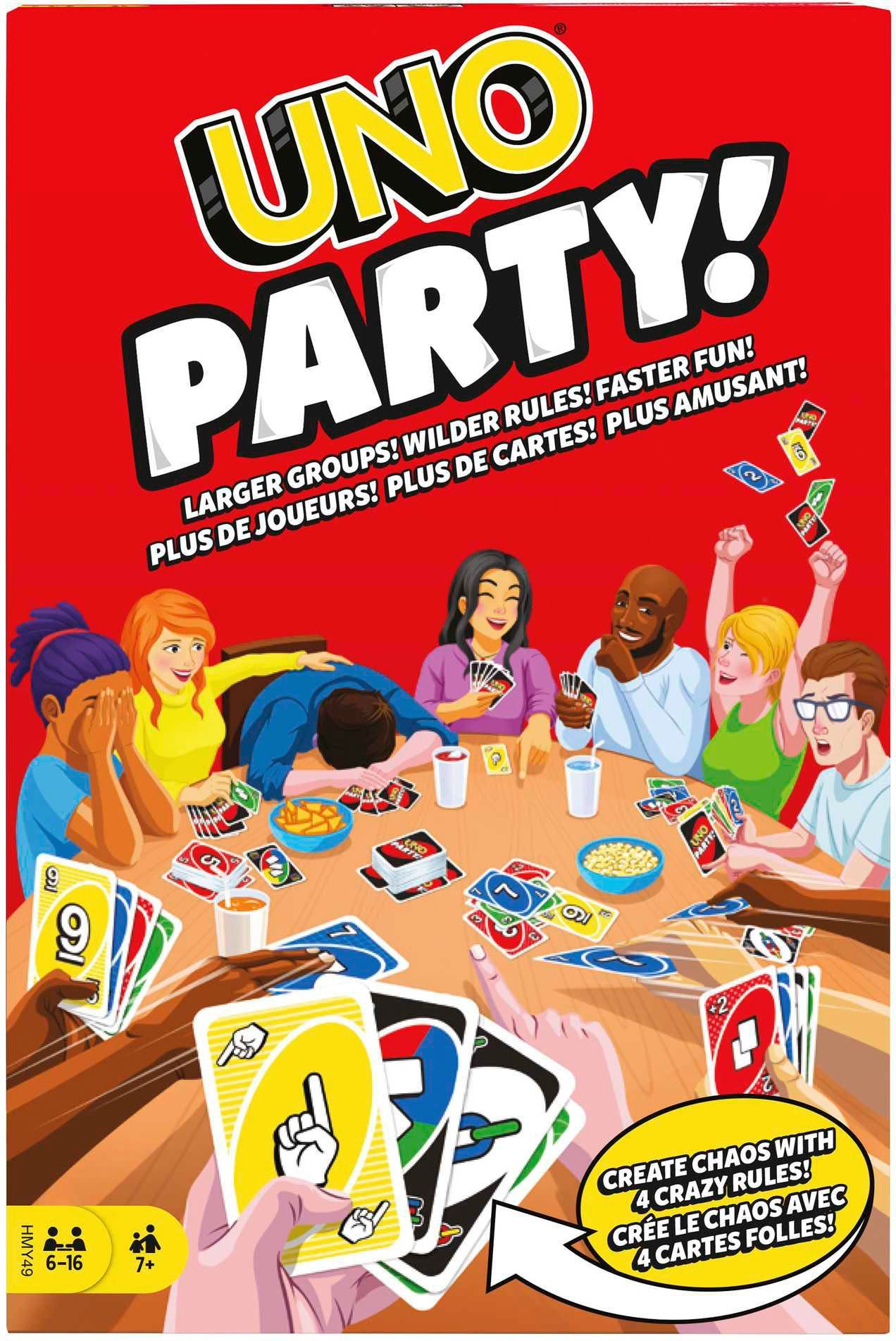 Bei diesem UNO Party-Kartenspiel machen alle mit: klassisches Kartenspielen, das UNO Kartenspiel-Spieler kennen und lieben sowie Sonderkarten und spezielle Regeln für große Gruppen und langen Partyspaß! Die Regeln dieser Version sehen vor, dass Spieler Karten solange an jemanden weitergeben, bis jemand nicht mehr spielen kann. Zudem wird auf Spieler gezeigt, damit sie Karten ziehen, und zwei Spieler werden zusammengetan, die zur gleichen Zeit ziehen müssen. Es gibt sogar eine neue Schnellspielregel. Für 6 bis 16 Spieler ab 7 Jahren verspricht UNO Party viel Spielspaß für Familien und Freunde auf Partys und bei Spieleabenden!