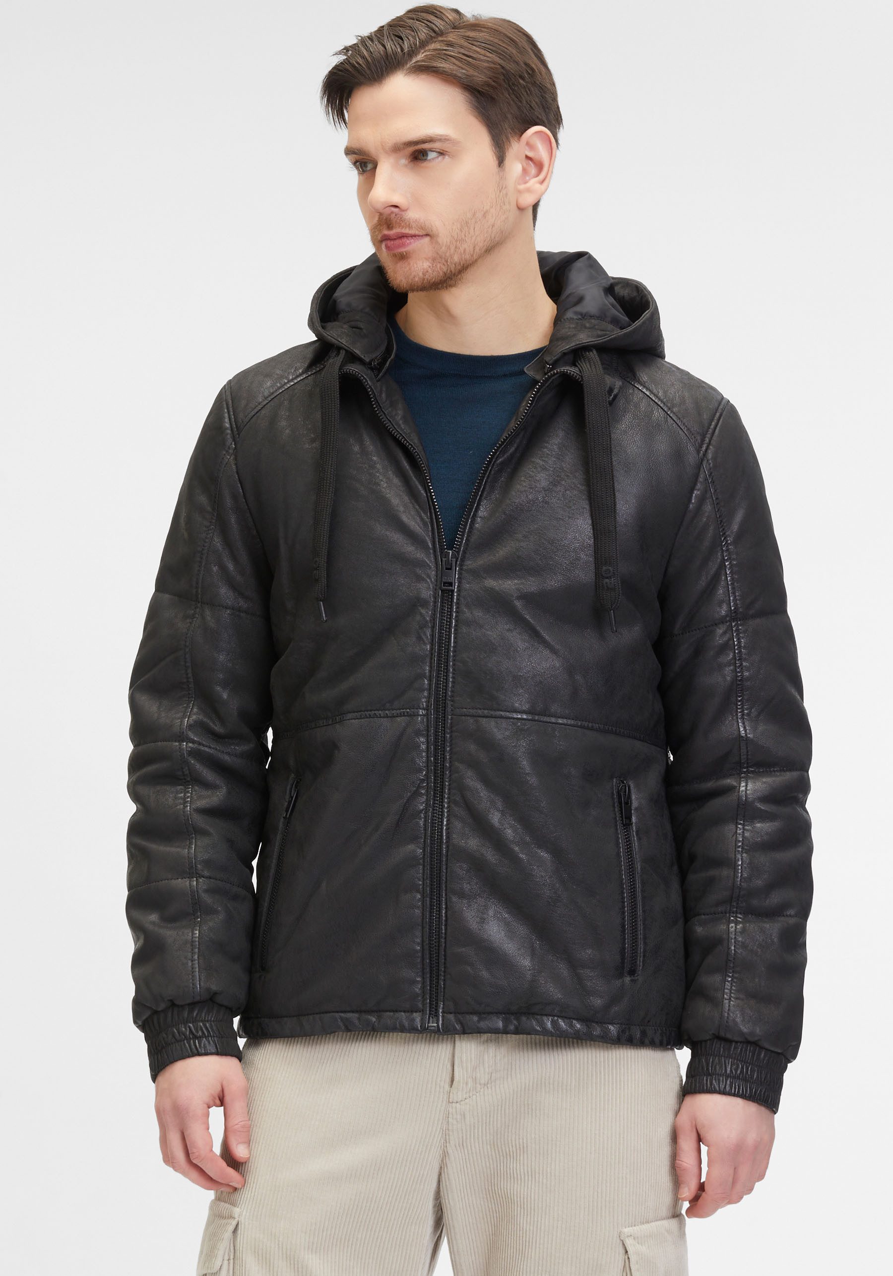 Die Lederjacke »G2MAbito OS« von Mauritius wird zu deinem Lieblingsstück. Die langen Ärmel schließen mit einem angesetzten Bündchen mit Gummizug ab. Für einen lässigen Look oder an warmen Tagen können sie auch hoch gezogen getragen werden. Die Lederjacke ist kurz geschnitten. Die Kapuze kannst du mit einem Kordelzug in der Weite verstellen. Dank der Fütterung bleibt dein Kopf warm. Mit den Reißverschlusstaschen können wichtige Dinge wie Geldbeutel und Handy nicht mehr herausfallen.