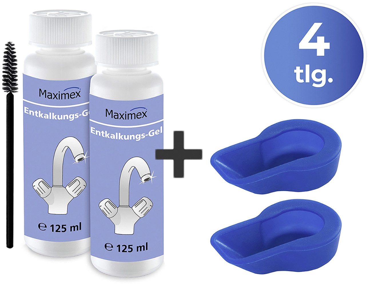Set-Bestandteile | 2 x Anti-Kalk-Cap, 2 x Entkalkungsgel, Bürste |