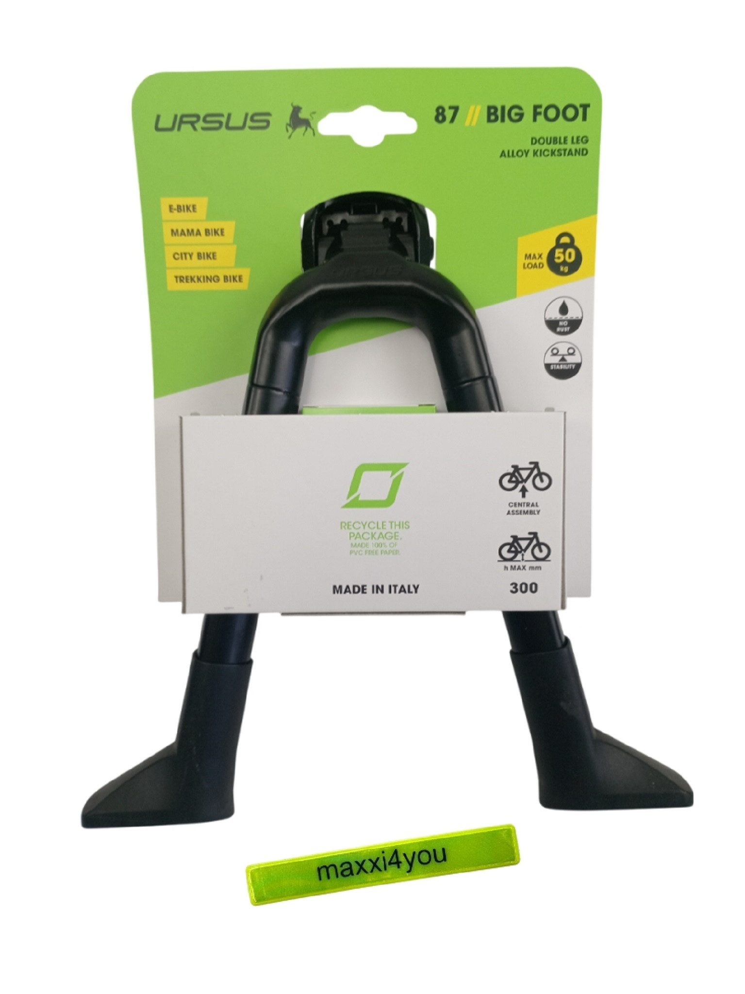 1 x Fahrrad Zweibeinständer Ursus "Big Foot" für 28 Zoll - Schwarz inkl. maxxi4you Reflexband