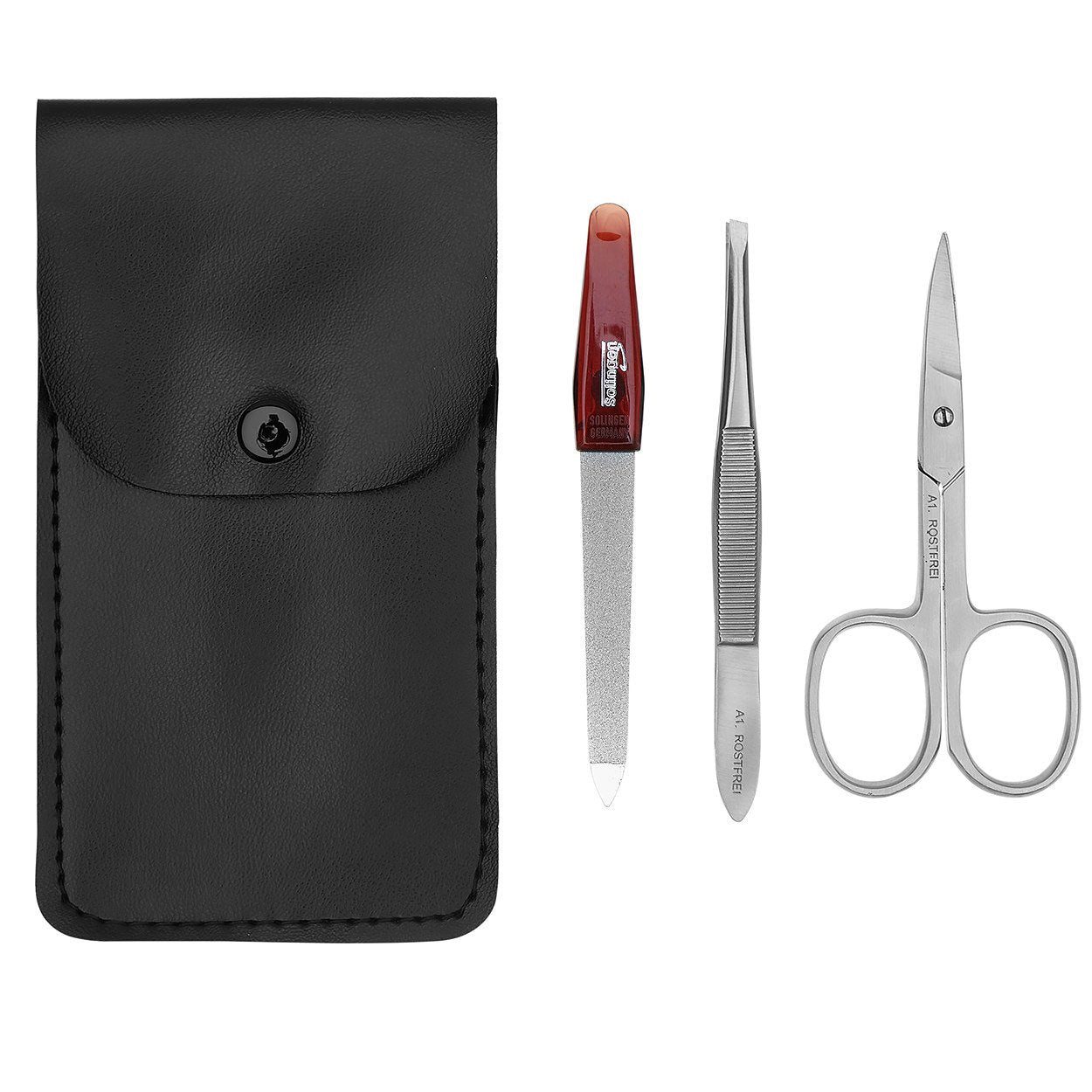 • Inhalt: 1 x Nagelschere Standard - rostfreier Edelstahl, 1 x Haarzupfpinzette - rostfreier Edelstahl - 1 x Saphirnagelfeile aus Solingen