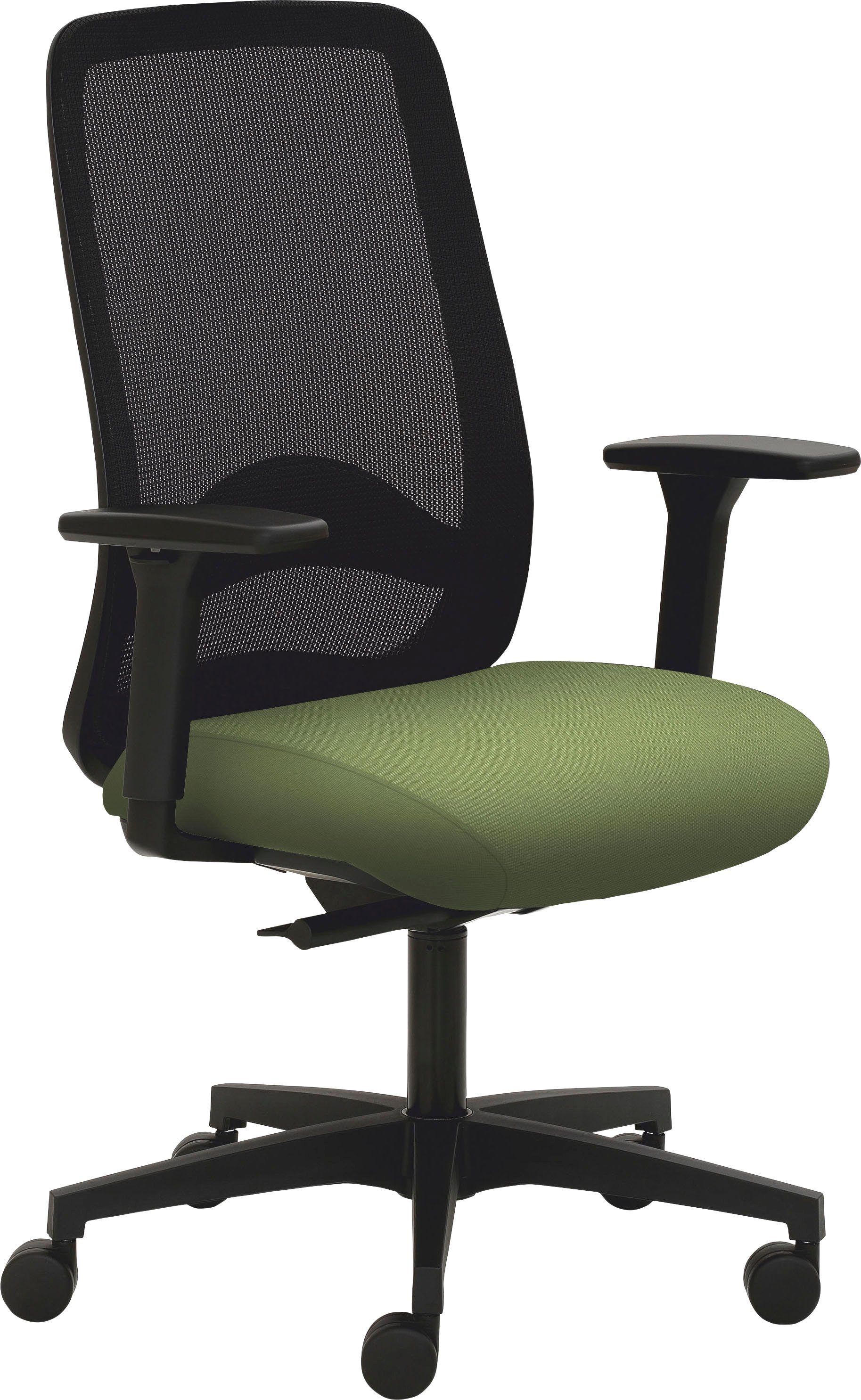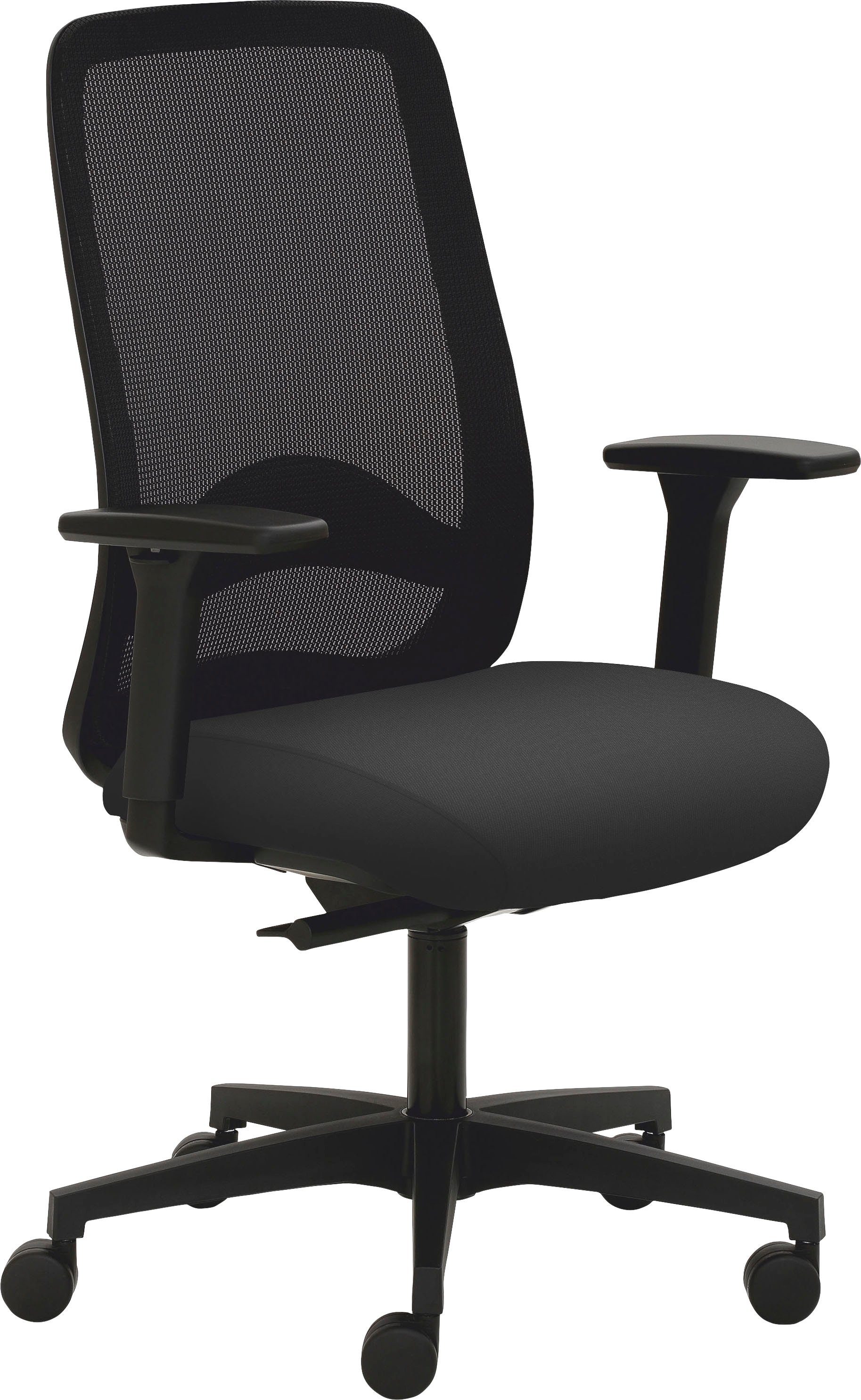 Ausführung | 3D-Armlehnen schwarz Kunststoff-Fußkreuz schwarz Synchronmechanik mit selbstregulierender Gewichtseinstellung Teppichbodenrollen hoher Netzrücken |