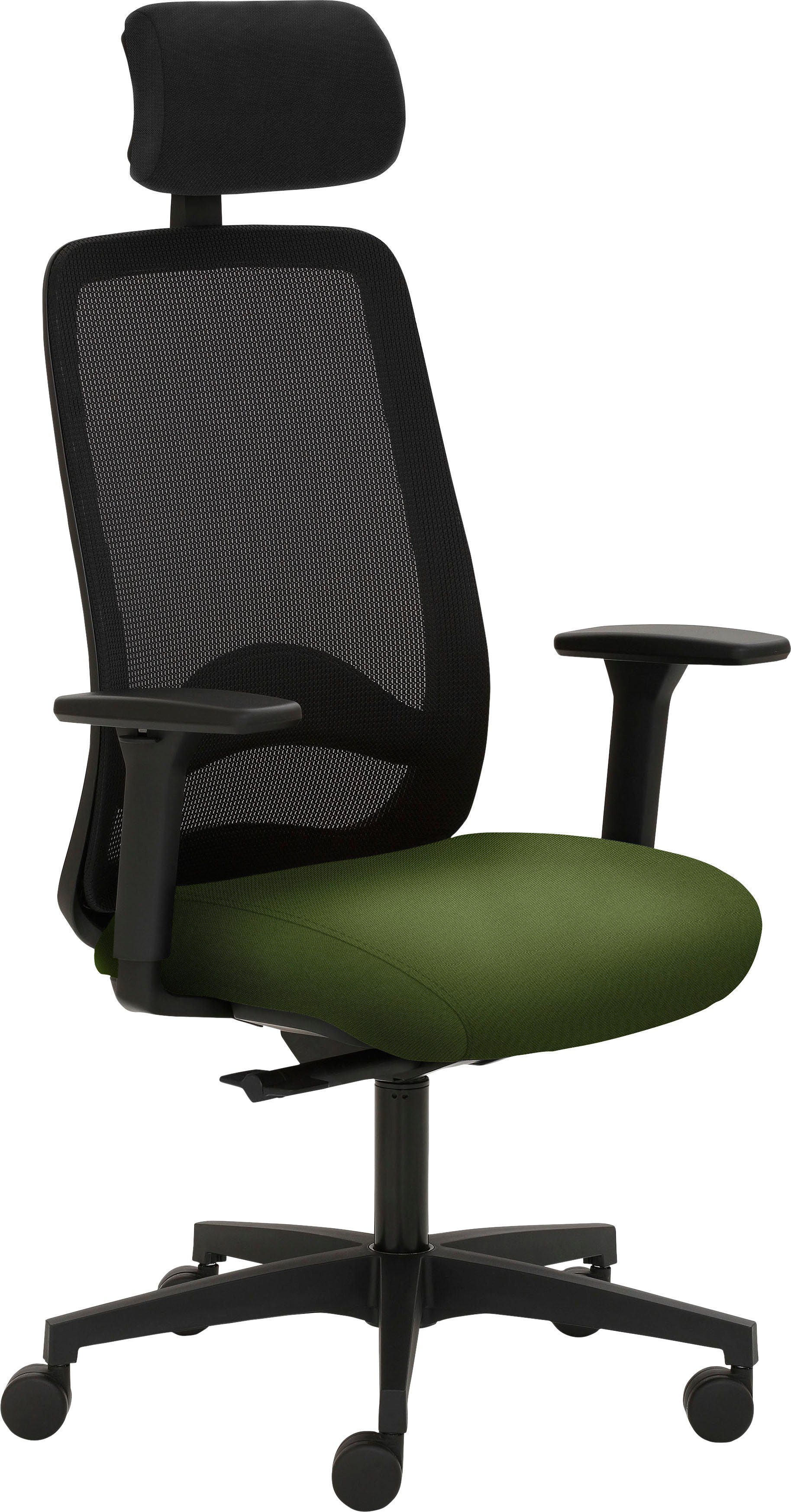 Ausführung | Kopfstütze gepolstert Kunststoff-Fußkreuz schwarz Synchronmechanik mit selbstregulierender Gewichtseinstellung und Sitztiefenverstellung Teppichbodenrollen hoher Netzrücken höhenverstellbare Armlehnen schwarz |