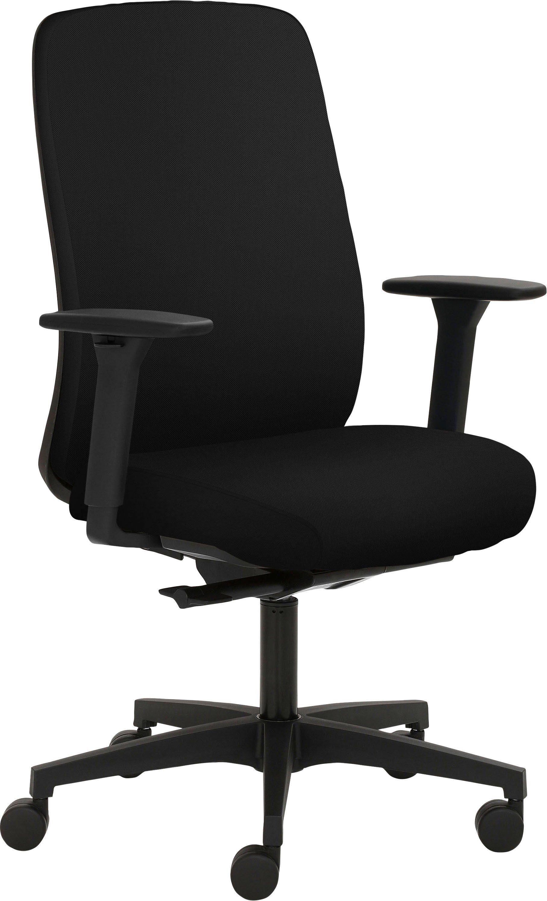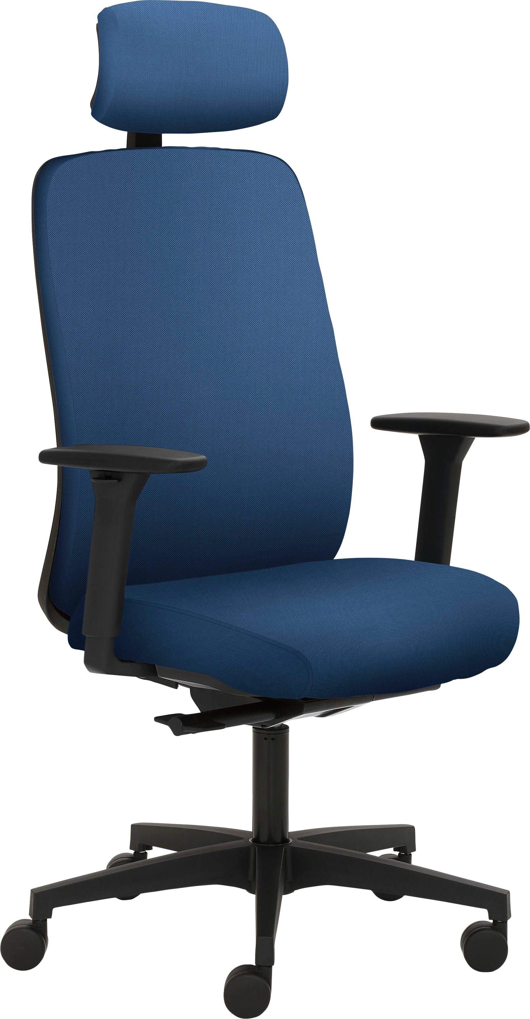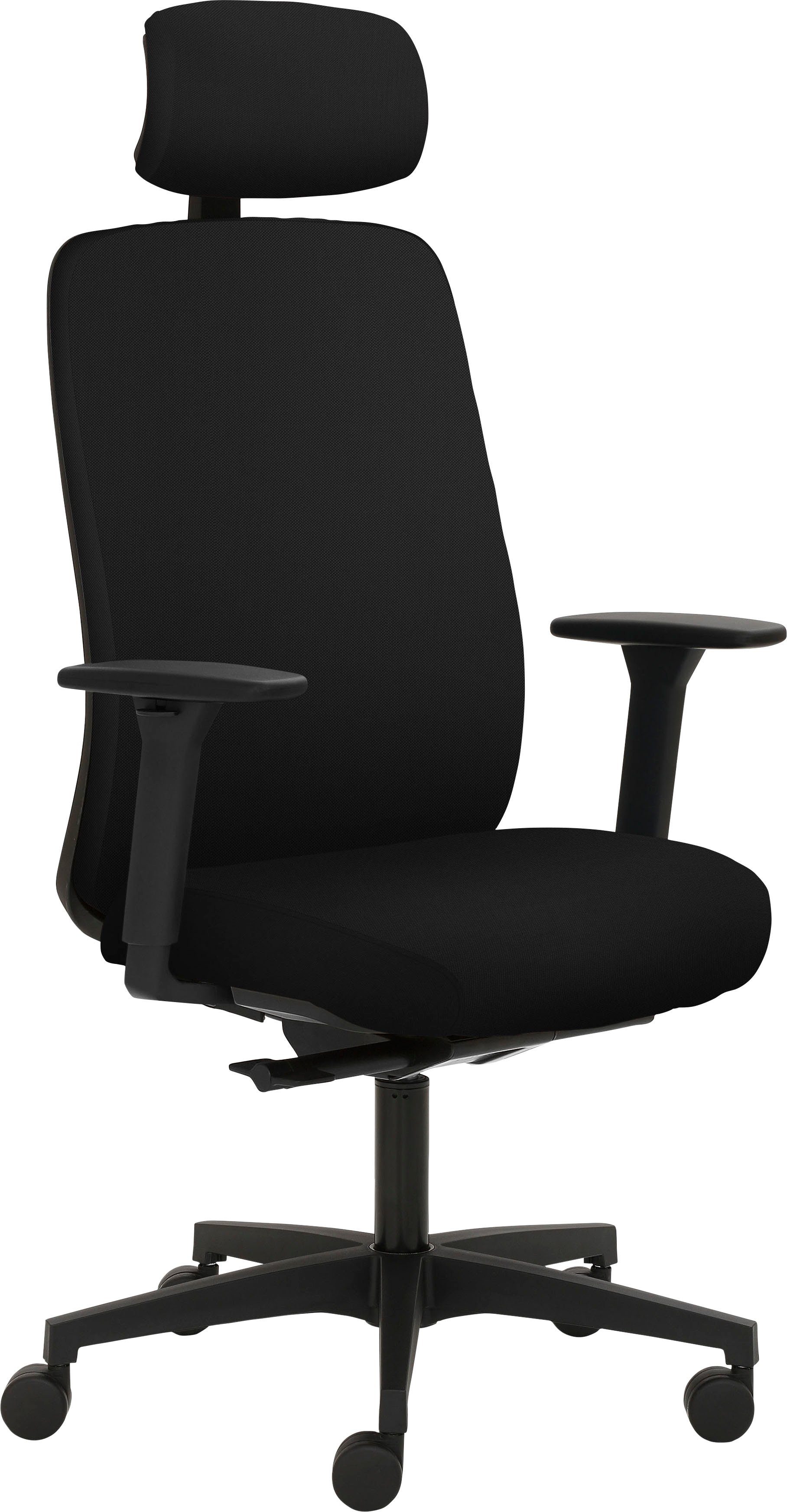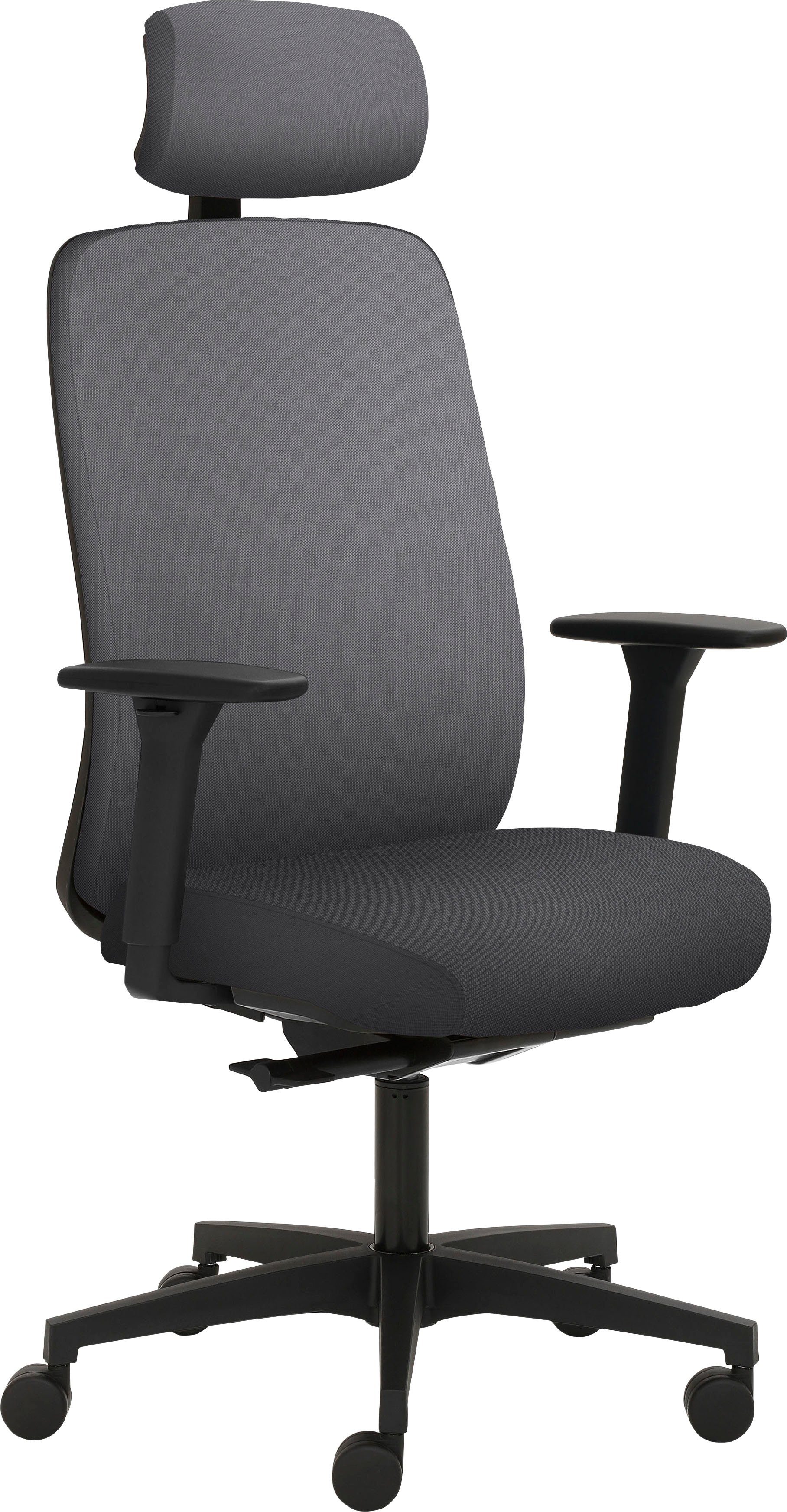 Ausführung | 3D-Armlehnen schwarz Kopfstütze gepolstert Kunststoff-Fußkreuz schwarz Synchronmechanik mit selbstregulierender Gewichtseinstellung und Sitztiefenverstellung Teppichbodenrollen hoher Polsterrücken |