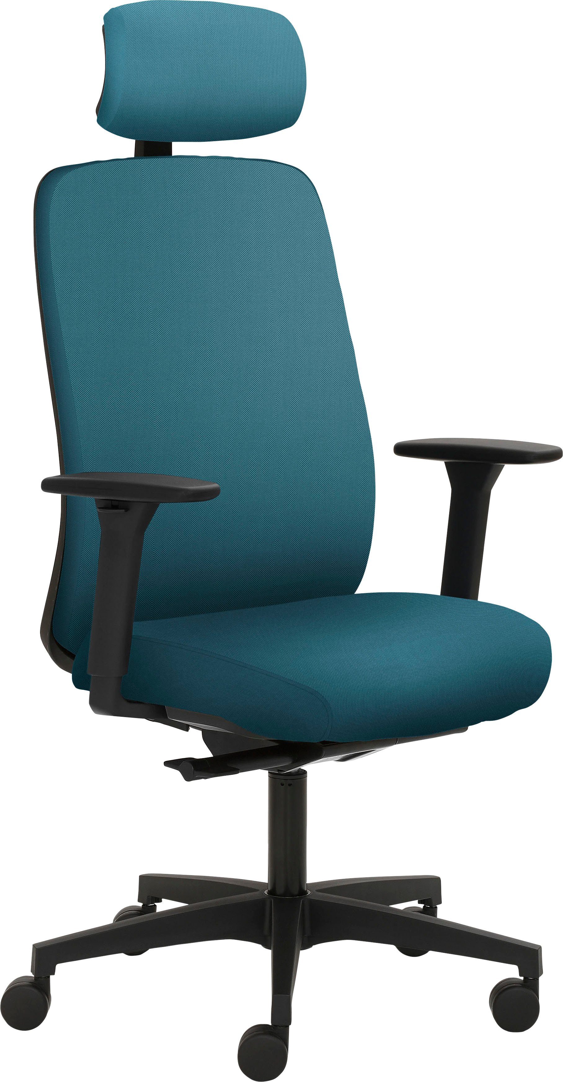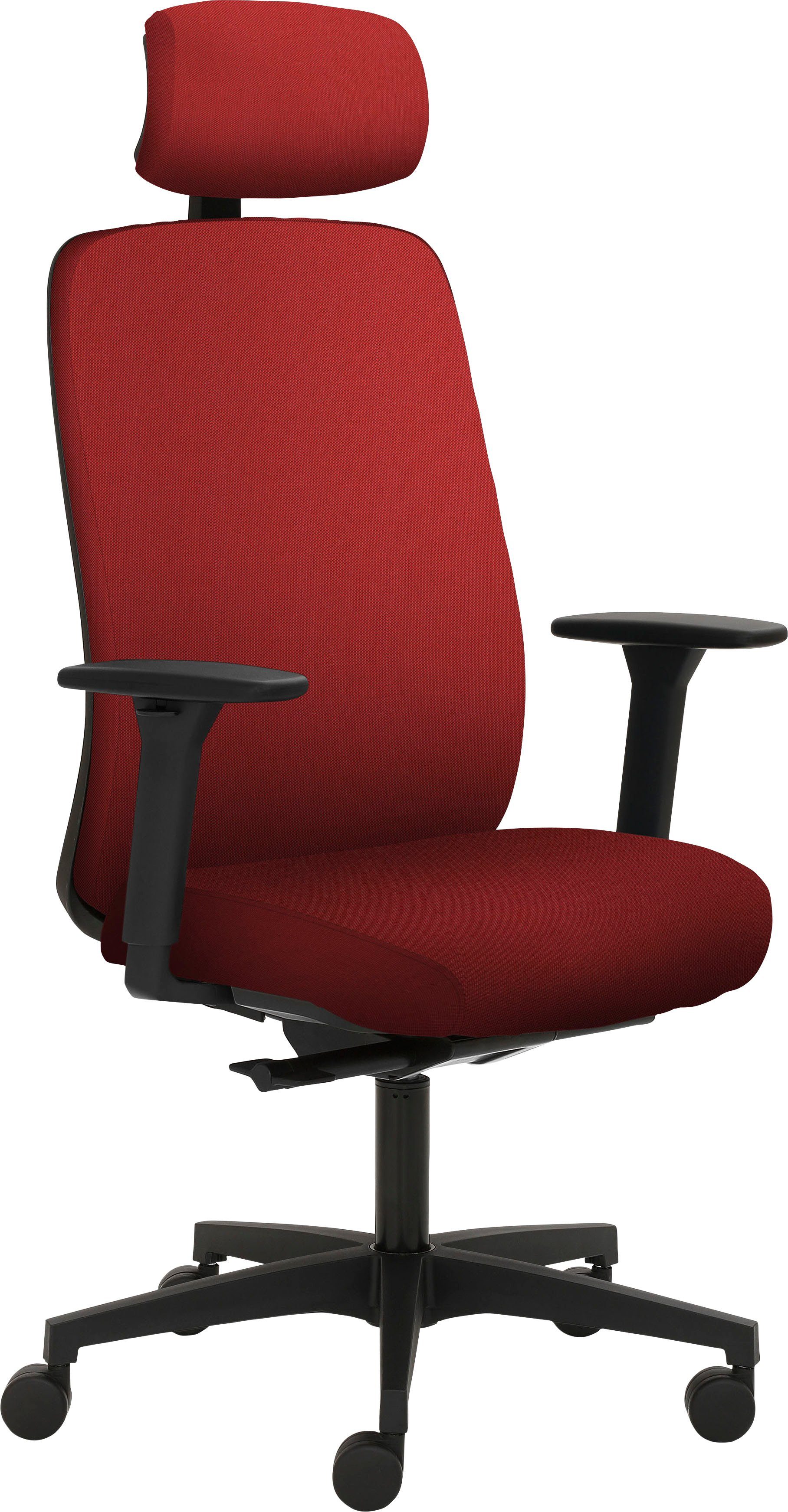 Ausführung | Kopfstütze gepolstert Kunststoff-Fußkreuz schwarz Synchronmechanik mit selbstregulierender Gewichtseinstellung und Sitztiefenverstellung Teppichbodenrollen hoher Polsterrücken höhenverstellbare Armlehnen schwarz |