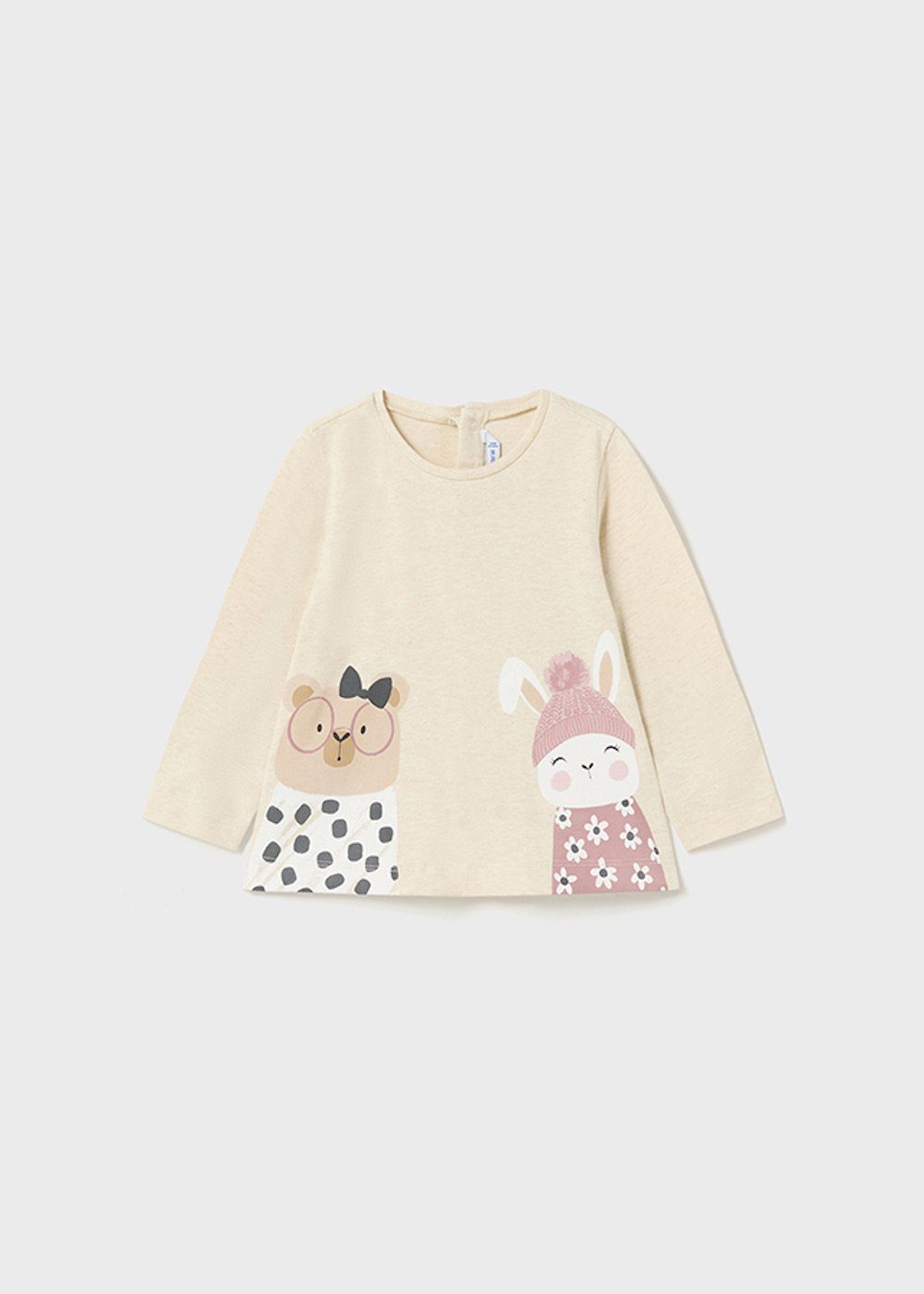 Langarm-T-Shirt in den vielseitigen Farben Beige und Schwarz. Dieses T-Shirt kombiniert Stil, Komfort und niedliche Motive für Babys. Unser T-Shirt besteht aus einer hochwertigen Materialmischung: 57% Baumwolle, 38% Polyester und 5% Elasthan. Diese Kombination gewährleistet ein angenehmes Tragegefühl, eine gute Passform und eine langanhaltende Qualität. Die besondere Eigenschaft dieses T-Shirts ist der Motivdruck auf der Vorderseite. In Schwarz präsentiert es ein entzückendes Mädchenmotiv, während das beige T-Shirt mit süßen Hasen und Bären verziert ist. Diese liebevollen Motive verleihen jedem Outfit eine spielerische Note. Das T-Shirt ist leicht ausgestellt, was für Bewegungsfreiheit und Komfort sorgt. Es ist auch mit einem praktischen Druckknopf hinten versehen, der das An- und Ausziehen erleichtert und gleichzeitig eine sichere Passform gewährleistet. Die BCI-Baumwolle sorgt nicht nur für Weichheit und Komfort, sondern trägt auch zu nachhaltigeren Anbaumethoden bei.