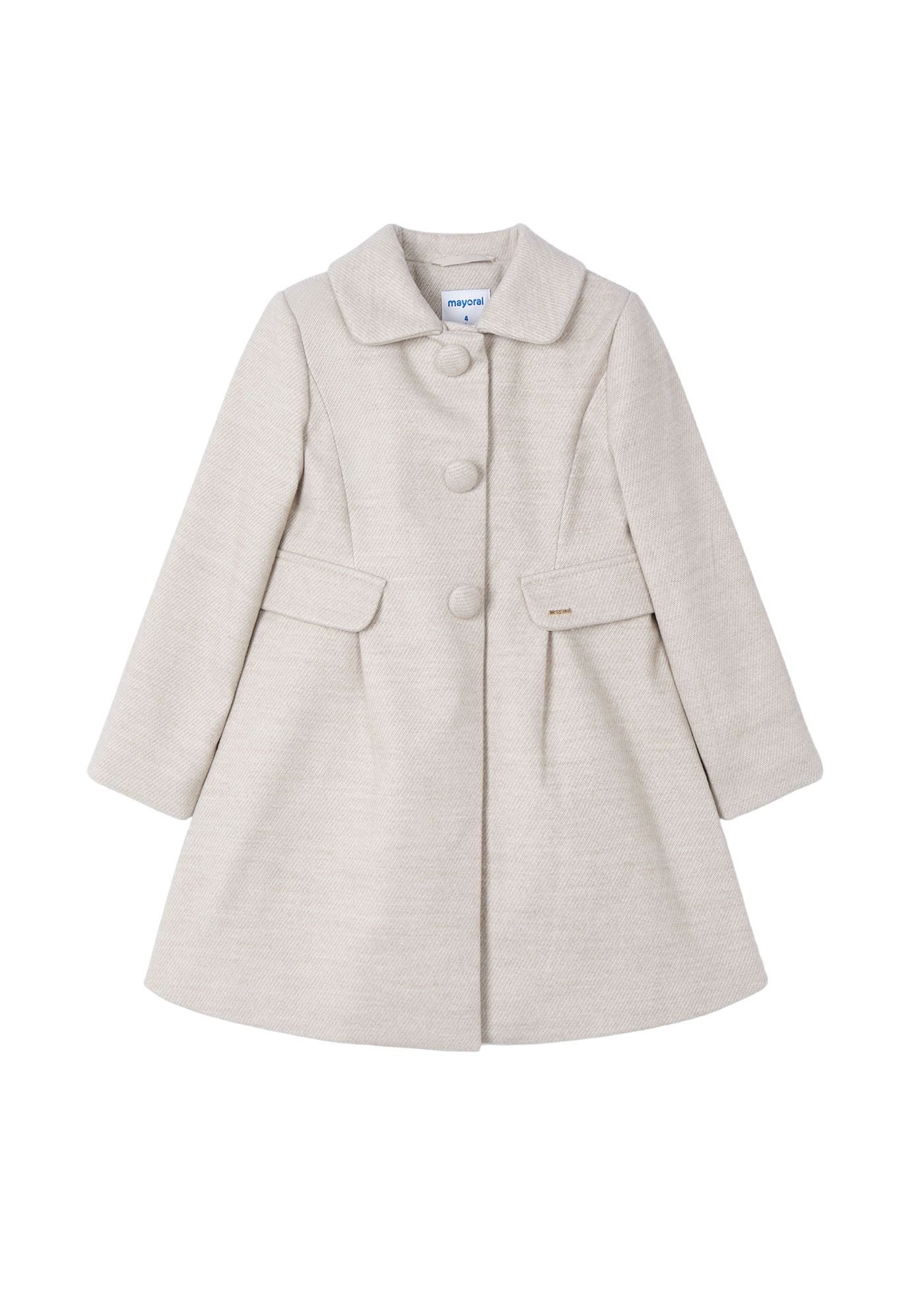 Der Mayoral Mädchen Wintermantel in hellem Beige ist der ideale Begleiter für junge Damen, die sowohl im Alltag als auch zu besonderen Anlässen stilvoll und warm gekleidet sein möchten. Dieser elegante Mantel aus hochwertigem Mischgewebe in Wolloptik bietet dank seines Polyesterinnenfutters zusätzlichen Komfort. Mit praktischen Druckknöpfen, einem stilvollen abgerundeten Umlegekragen und einem ausgestellten Schnitt, der bis zum Knie reicht, vereint er Funktionalität mit modischem Design. Perfekt über jedes Kleid, ist dieser Mantel eine hervorragende Wahl für den Weg zur Schule oder für festliche Anlässe, und ein Must-have für jede junge Fashionista.