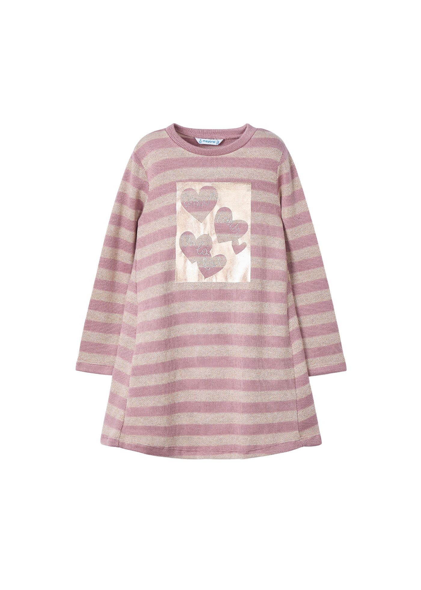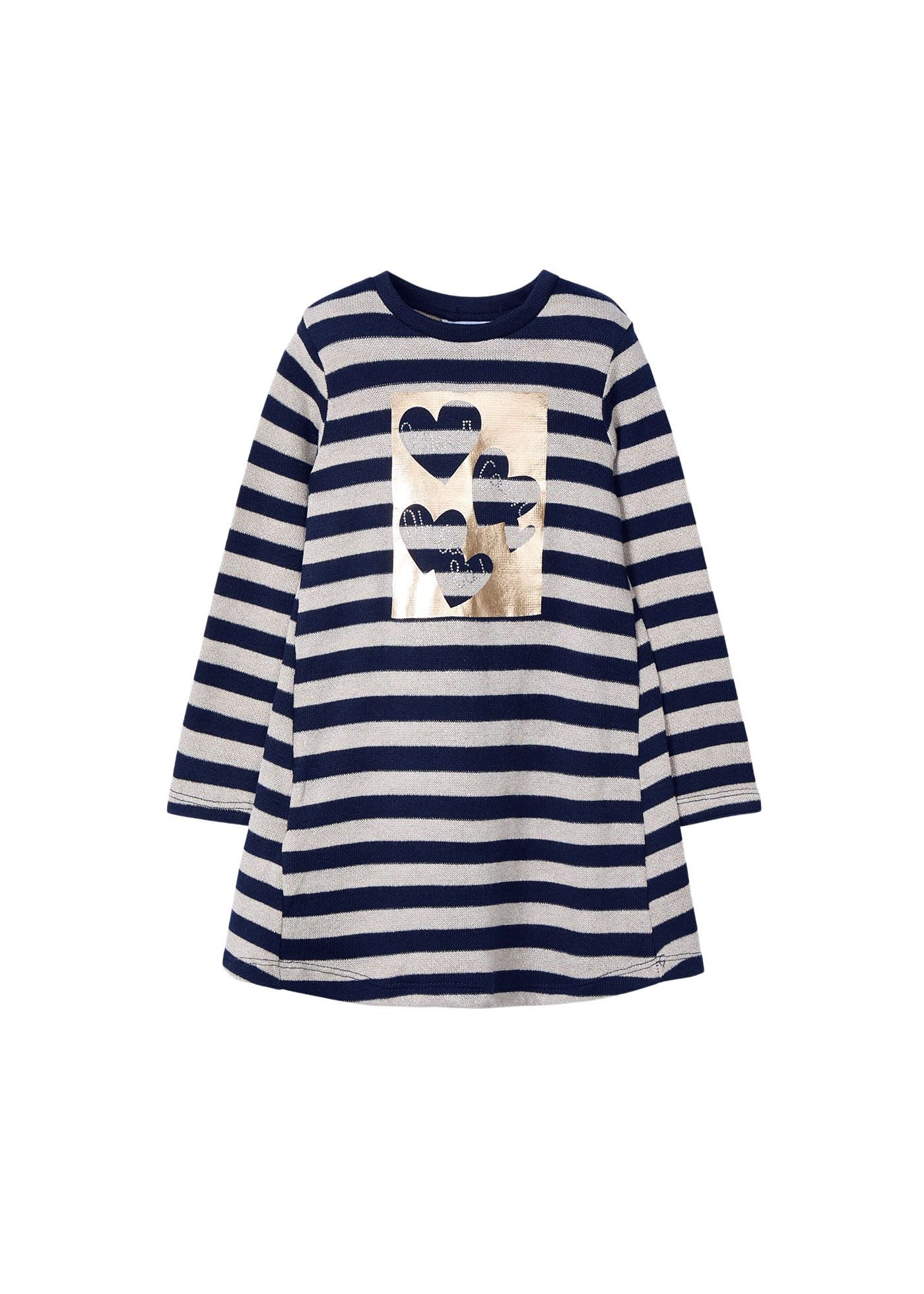 Das Mayoral Strickkleid zeichnet sich durch seinen knielangen, ausgestellten Schnitt und Blockstreifen mit eingearbeiteten Metallfäden aus, die einen subtilen Glitzereffekt bieten. Mit langen Ärmeln und einem Rundhalsausschnitt bietet das Kleid Komfort und Stil. Ein besonderes Highlight ist das Herzmuster auf der Vorderseite, verziert mit Glitzersteinchen, das dem Kleid eine persönliche und funkelnde Note verleiht. Dieses Kleid ist ideal für festliche Anlässe oder besondere Momente, bei denen ein eleganter, aber bequemer Look gefragt ist.