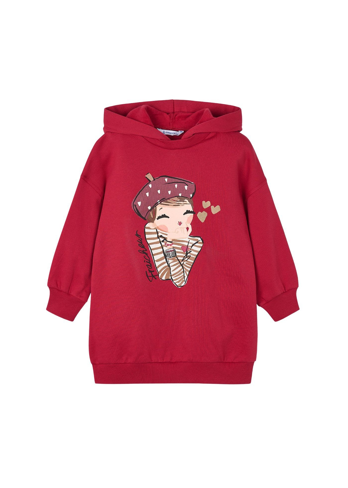 Dieses Sweatkleid von Mayoral ist der ideale Begleiter für bewegungsfreudige Mädchen. Der kurze, gerade Schnitt bietet viel Bewegungsfreiheit, während das weiche Sweatmaterial innen leicht angeraut für kuscheligen Tragekomfort an kühleren Tagen sorgt. Die sportliche Kapuze schützt vor Wind und Wetter und macht das Kleid zum stylischen Alltagsfavoriten. Der coole Frontprint setzt einen modischen Akzent, der jedes Outfit aufpeppt. Ob kombiniert mit Leggings, Strumpfhosen oder Sneakers – dieses Sweatkleid ist vielseitig und schnell gestylt, perfekt für Kindergarten, Freizeit und entspannte Tage.
