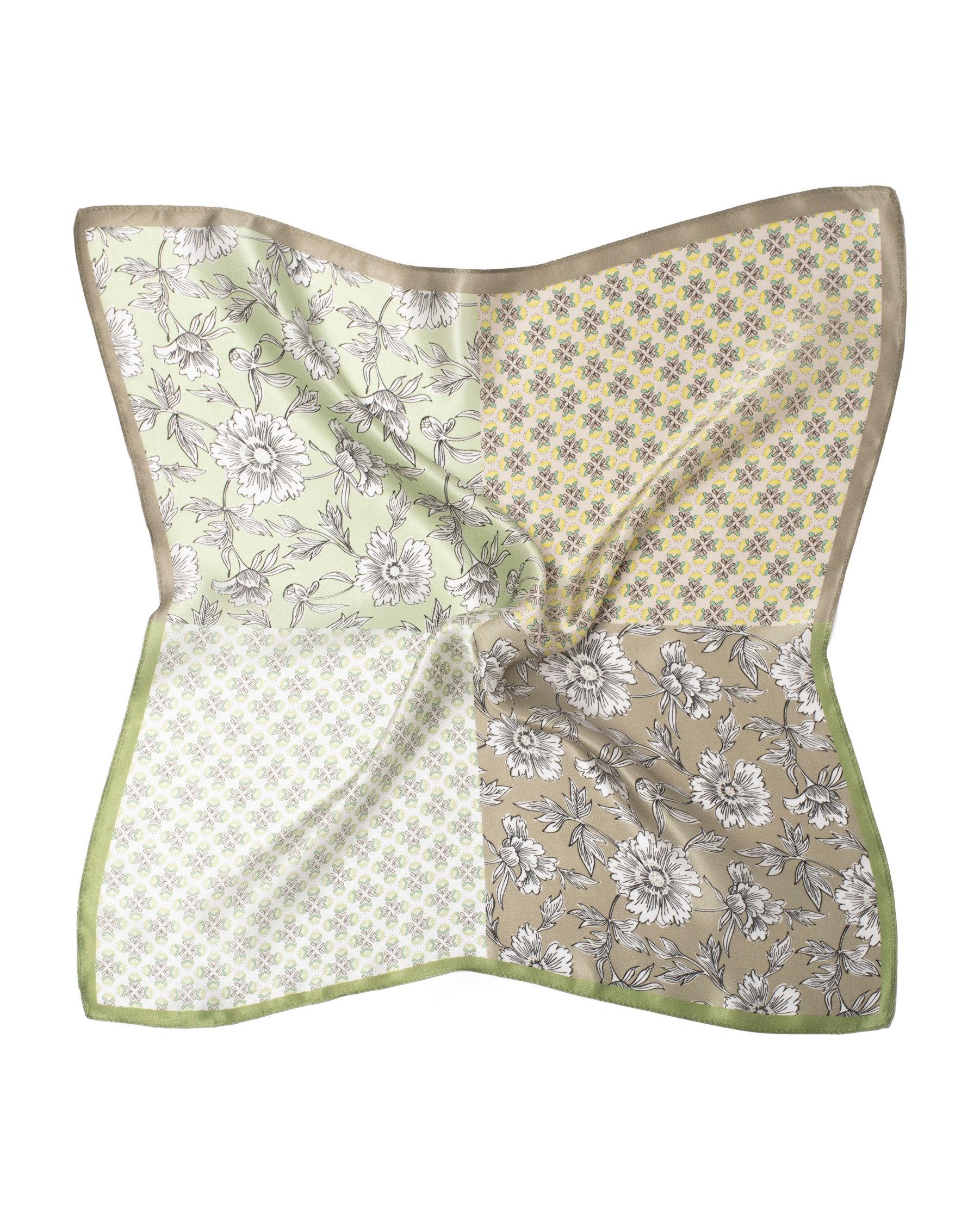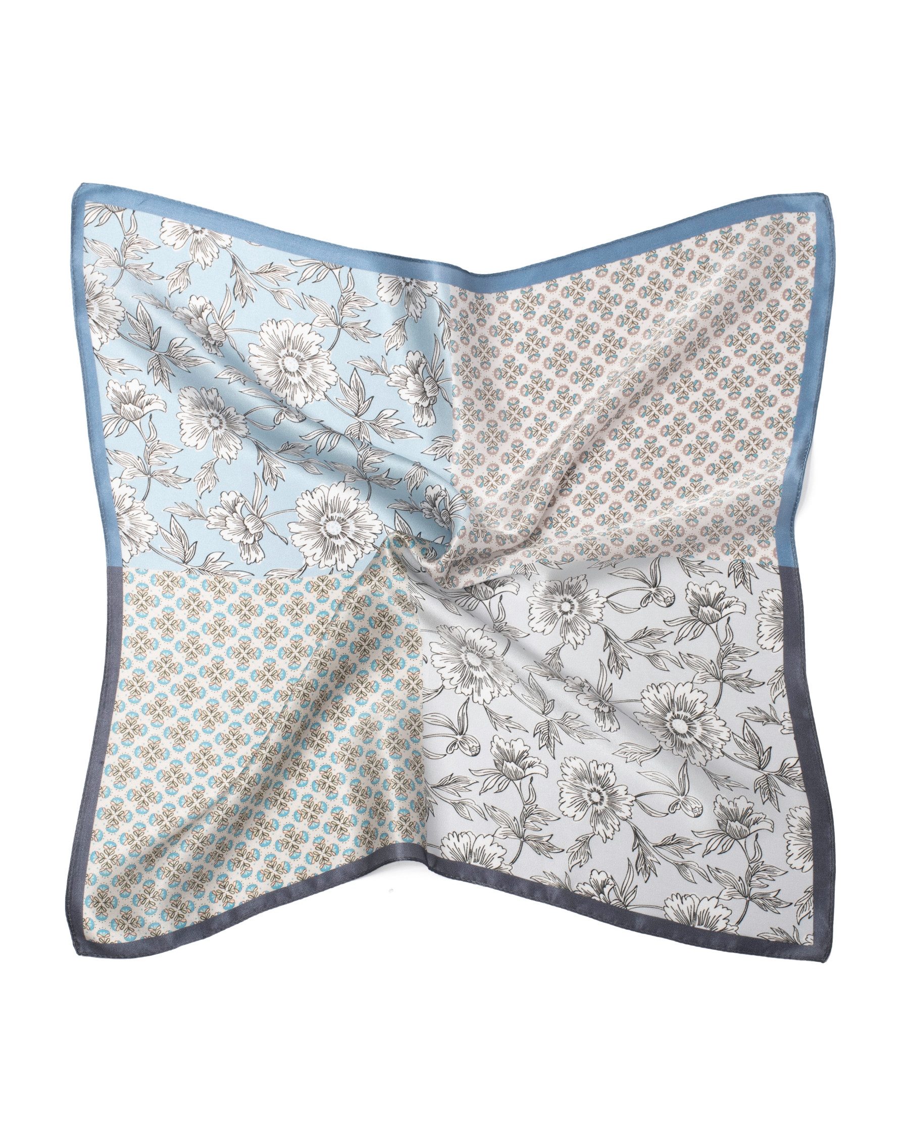 Dieses edle Tuch aus 100 % reiner Seide vereint vier harmonisch aufeinander abgestimmte Blumenmuster in feinen Hellblau- und Silbertönen. Die zarte Farbgebung und das florale Design verleihen jedem Outfit eine frische, feminine Note. Leicht, weich und luxuriös – ein stilvoller Allrounder für Alltag und besondere Anlässe.