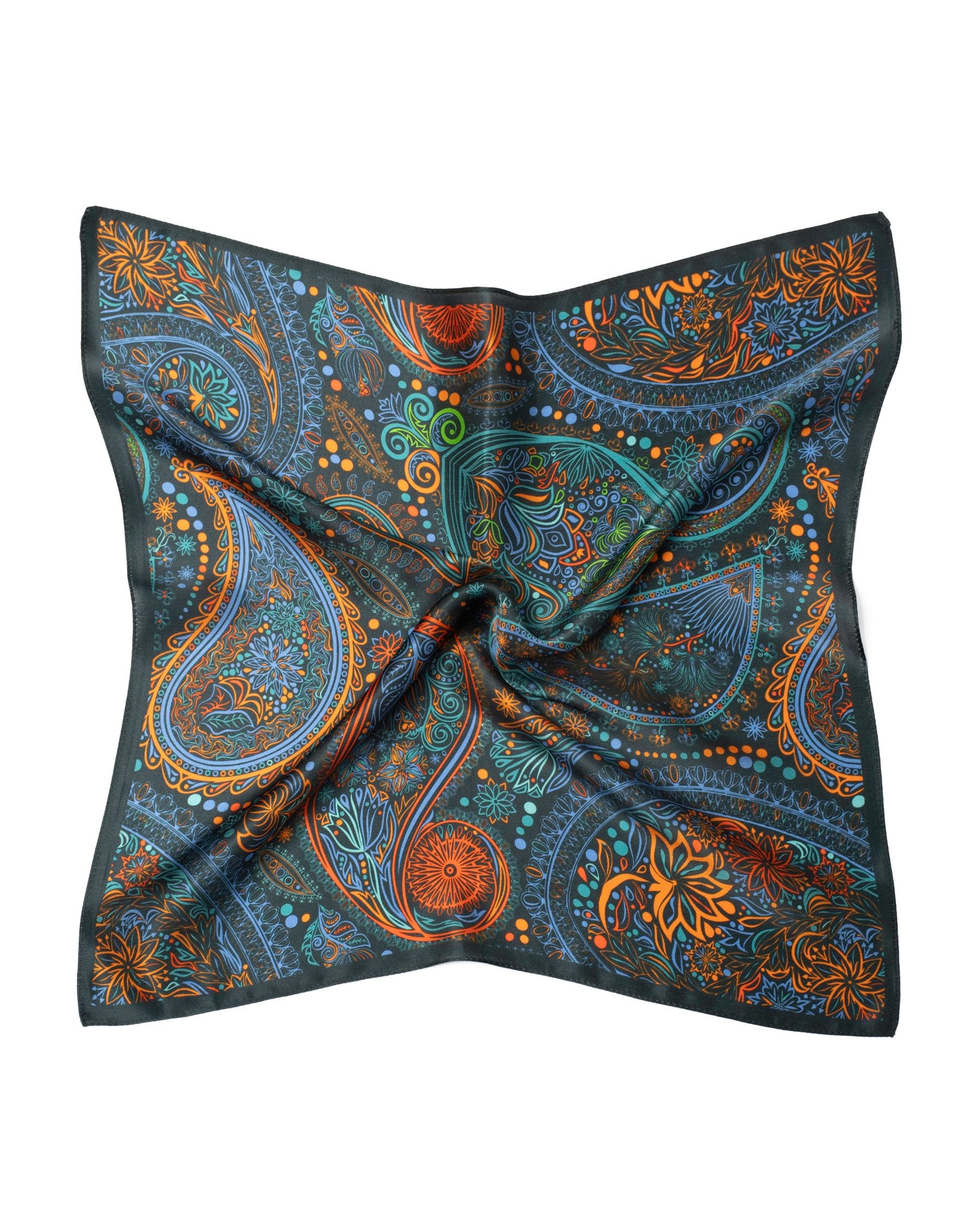 Paisley Dunkelgrün Neon – leuchtende Eleganz trifft auf klassischen Charme Dieses farbenfrohe Seidentuch aus 100 % reiner Seide vereint ein traditionelles Paisley-Muster mit modernen, leuchtenden Akzenten in Neonorange und Türkis. Der dunkle Grundton bringt die Farben besonders schön zur Geltung. Ein ausdrucksstarkes Accessoire – stilvoll und besonders!