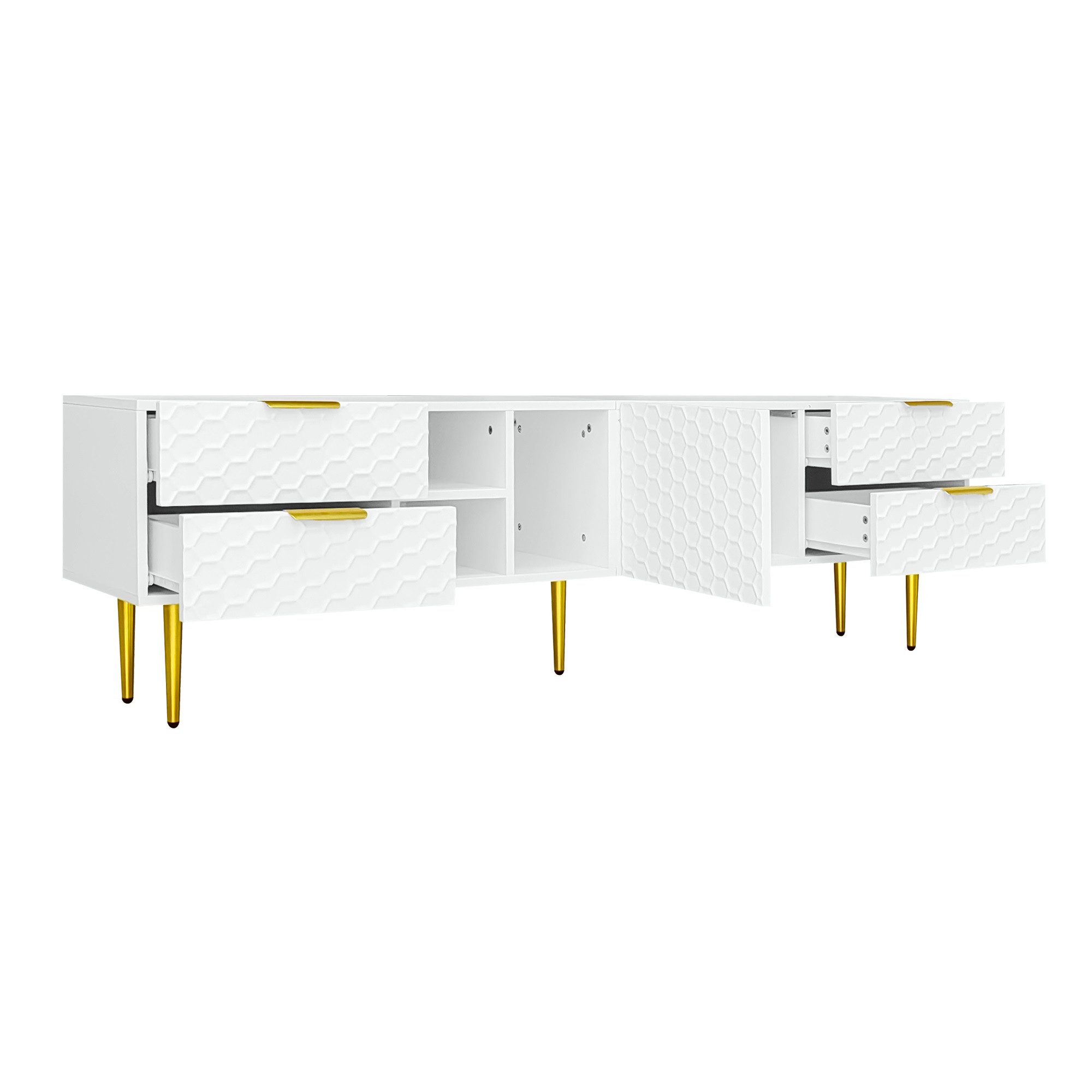 TV-Möbel mit Schubladen, offenen Fächern, goldenen Griffen und goldenen Füßen
