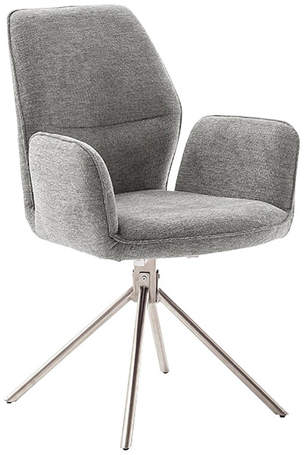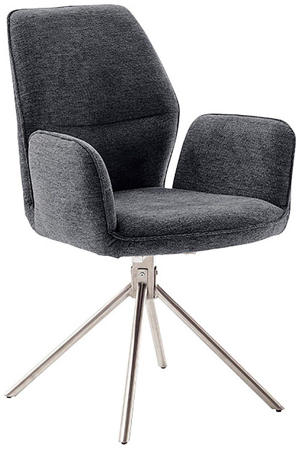 Mit diesem Esszimmerstuhl »GREYTON« von MCA furniture kommst du der Wohlfühl-Atmosphäre wie in deinem Lieblings-Restaurant einen Schritt näher. Ohne den Stuhl anheben und verschieben zu müssen, kann dank der Drehfunktion ganz leicht Platz genommen werden. Praktisch ist das insbesondere in etwas kleineren Räumen. Komfort steht hierbei ganz weit oben, denn genauso wie die Sitzfläche, sind auch die Rücken- und Armlehnen gepolstert. Die maximale Belastbarkeit liegt bei einem Gewicht von 120 Kilogramm. Das Gestell aus Edelstahl wirkt widerstandsfähig und bringt die nötige Stabilität mit sich.