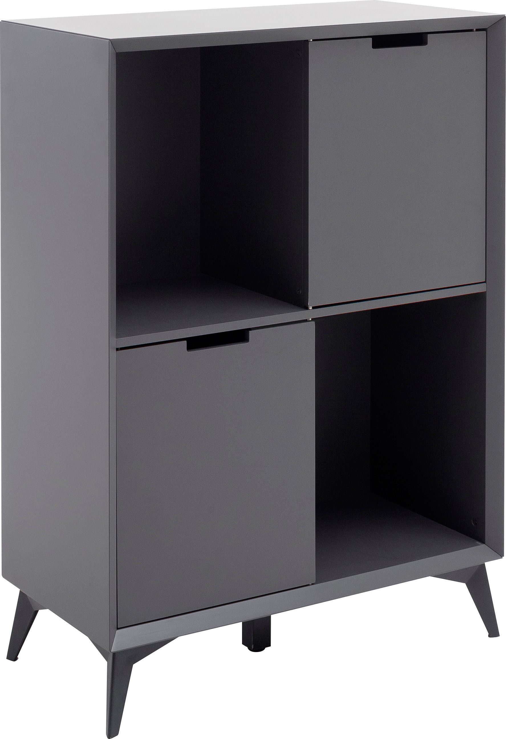 Wissenswertes | Belastbarkeit maximal 40 kg Boden bis Unterkante ca. 14 cm hoch Fronten wendbar in grau oder weiß lackiert Highboard mit Korpus in Grau matt lackiert Mit 2 Türen Türen drehbar 180° Türen mit Magnethalterung und Soft Close |