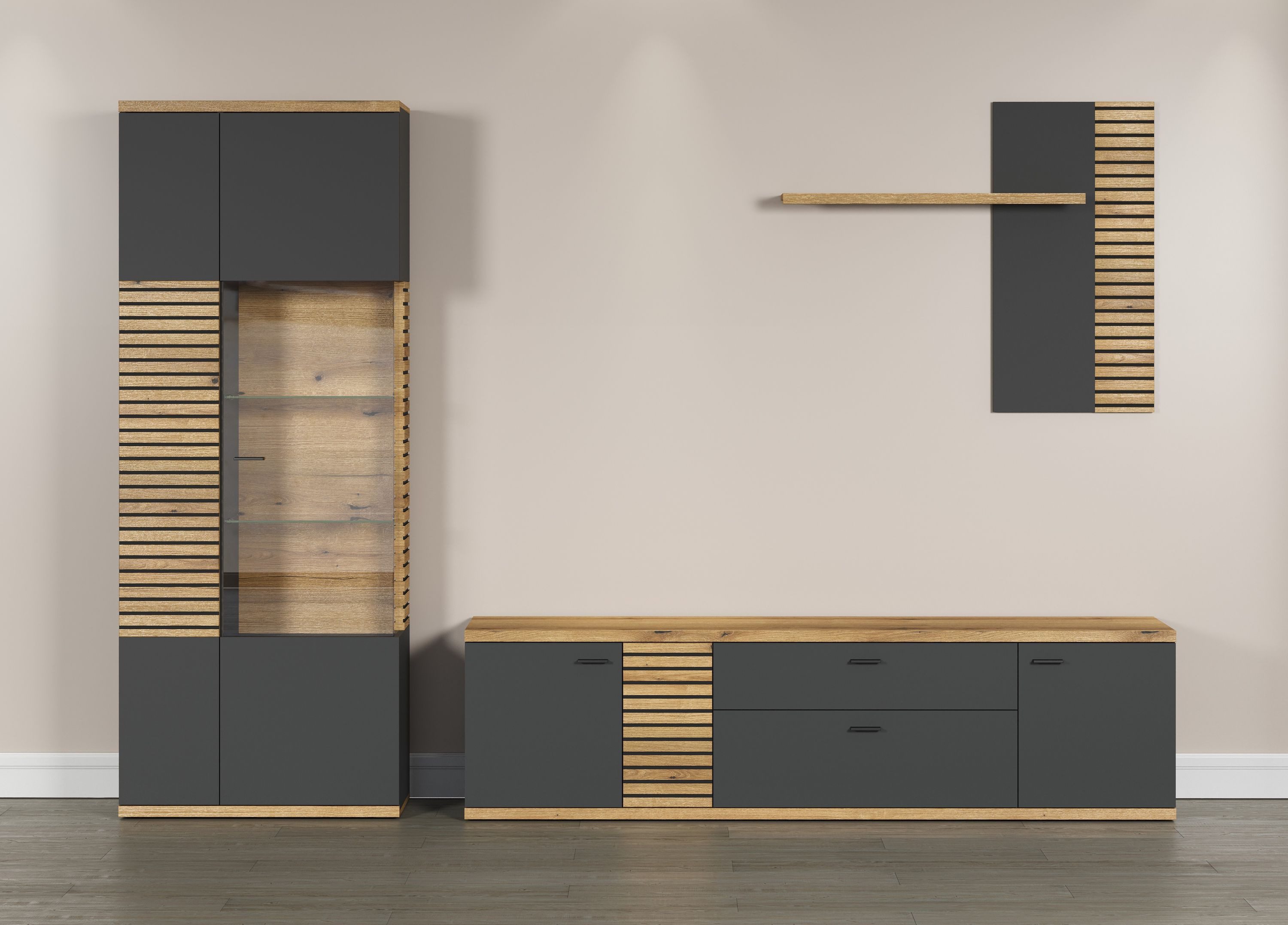 Entdecken Sie die stilvolle und funktionale Anbauwand mit den Maßen von 297 x 205 x 42 cm, die ideal für jedes Zuhause ist. Diese zeitgemäße Anbauwand kombiniert hochwertigen Holzwerkstoff mit einem eleganten Design und bringt eine moderne Note in Ihr Wohn- oder Arbeitszimmer. Die Kombination aus anthrazitfarbenem Melamin und der Coast Evoke Oak-Nachbildung verleiht der Anbauwand eine ansprechende Optik, während die schwarzen Rillen und der Kunststoffgriff das Gesamtbild abrunden. Die strukturierte Oberfläche sorgt nicht nur für eine ansprechende Optik, sondern ist auch besonders pflegeleicht. Mit genügend Stauraum und einer durchdachten Anordnung ist diese Anbauwand perfekt, um Ihre Lieblingsstücke stilvoll zu präsentieren und den Raum optimal zu nutzen.