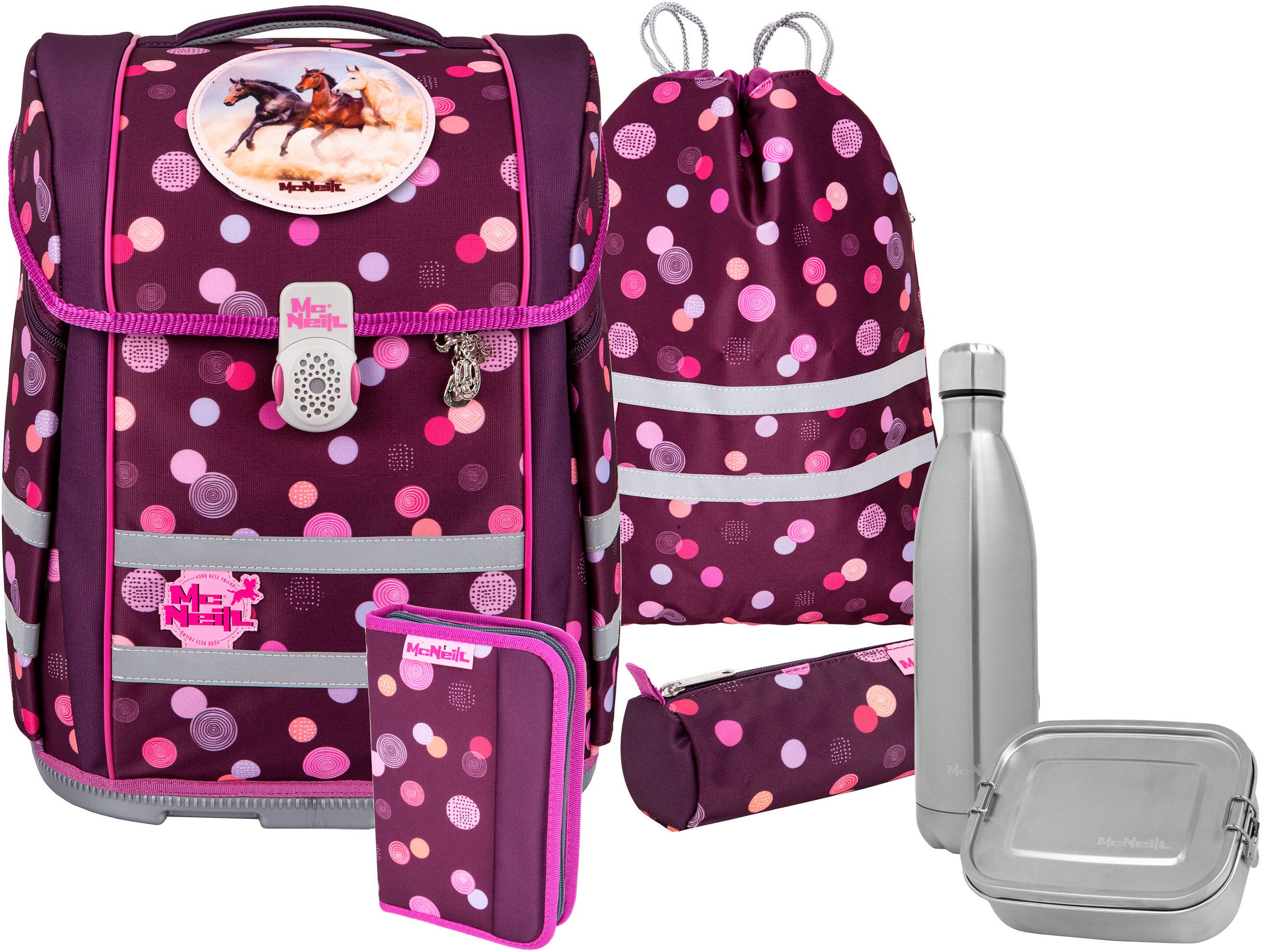 + Gratisgratis dazu: Brotzeitdose und Trinkflasche: Die McNeill Thermo-Trinkflasche. Passend zu den McNeill Ranzen, können bequem in den Seitentaschen der Ranzen mitgenommen werden. Füllmenge: ca. 500 ml. Material: Edelstahl. Die Lunchbox. Für das Pausenbrot, Obst und Gemüse, damit das Essen in der Pause schmeckt. B/T/H: ca. 14/17/6 cm. Material: Edelstahl. Bei nicht gefallen des Artikels beinhaltet die Rückgabe das Gesamtangebot.