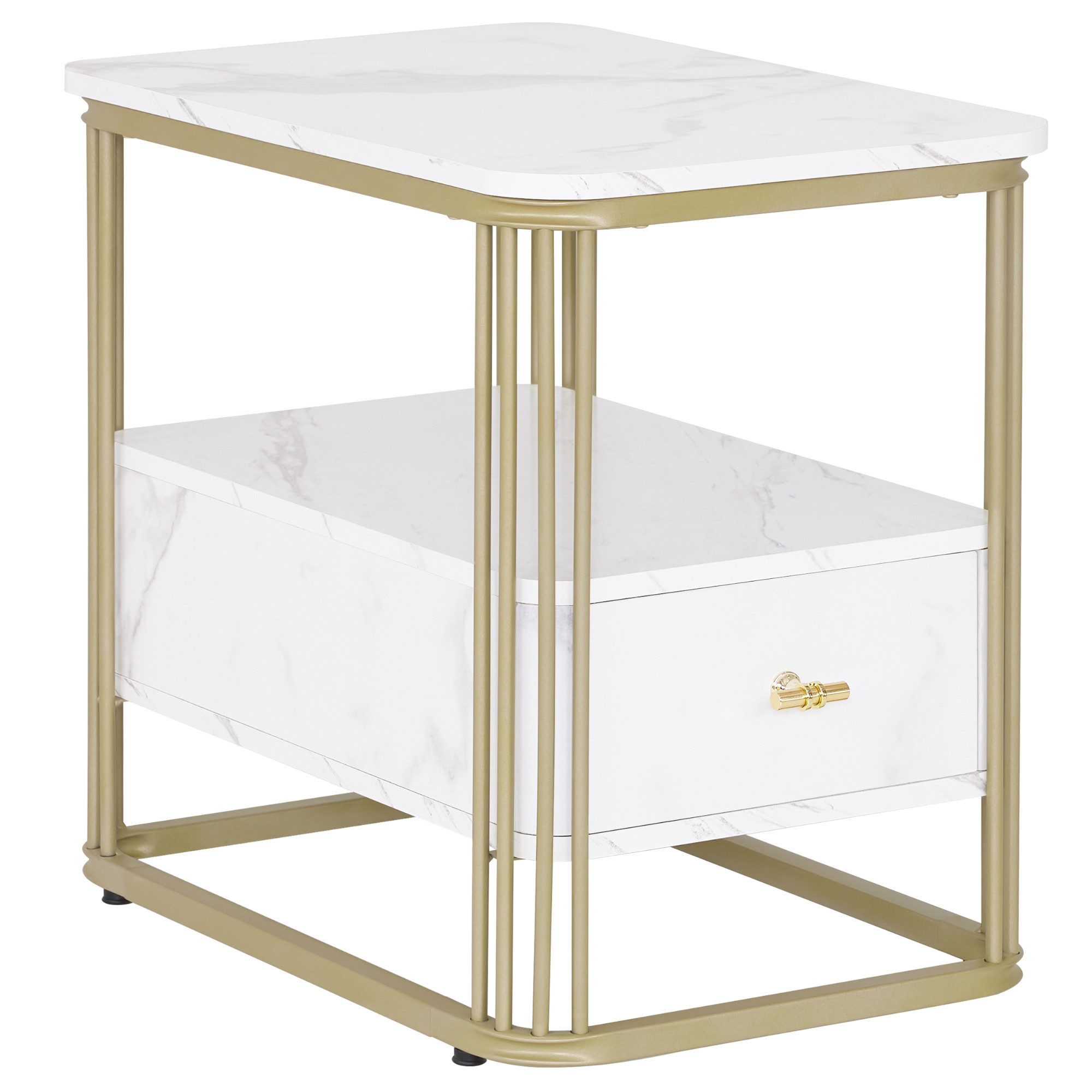 MCombo Beistelltisch Modern atemberaubende Kombination aus Vintage-Eleganz und dezentem Luxus Das weiße Marmormuster trifft auf Gold: zeitlose Eleganz und luxuriöses Flair; das simple Designkonzept, feine und exquisite Verarbeitung, ist nicht nur ein Möbel, sondern auch ein leichtes Luxuskunstwerk mit modischem Charme und Verlockung, das Ihnen ein wunderbares Lebensvergnügen beschert; dank robuster Stahlrohre und 4 Fußstifte ist der Konsolentisch sehr stabil Ausführung: Großer Stauraum: Mit Schublade (33, 5 x 23, 8 x 8, 5cm) und 2 Ablagen (60 x 40 cm) und bietet der Beistelltisch Ihnen einen ausreichenden Platz und macht Ihre verschiedenen Arbeitsutensilien ordentlich und griffbereit Luxuriös & modern: Marmorierte Tischplatte, Champagnergold lackiertes Stahlrohr, das vintage Design lasst man an das mittelalterliche Europa erinnern. Kombiniert mit anderen Dekorationsgegenständen verleiht Ihre Wohnung eine elegante Note Solide Konstruktion: Eine 15 mm starke MDF-Tischplatte, die von mehreren Stahlrohren getragen wird, sorgt für Langlebigkeit und Stabilität; der Couchtisch kann bis zu 75 kg belasten; 4 Fußstifte können Bodenunebenheiten ausgleichen Leicht zu reinigen: Dank der glatten Oberfläche ist der Kaffeetisch feuchtigkeitsbeständig und schmutzabweisend; Schmutz und Flecken können mit einem nassen Tuch von dem Beistelltisch leicht entfernt werden Wichtige Hinweise: ① Der Couchtisch wird in eine Box gepackt ②Die Montage ist mithilfe der Anleitung sehr einfach Technische Daten Typ: 6090-2138WG Farbe: Weiß-Gold Material der Tischplatte: MDF Material des Gestells: Metall Gesamtmaße: 60 cm(T) x 40 cm(B) x 55 cm(H) Platte Stärke: 1,5 cm Размер der Ablage: 60 cm(T) x 40 cm(B) Размер der Schublade: 33.5 cm(T) x 23,8 cm(B) x 8,5 cm(H) Max. Belastbarkeit: 75 kg Gewicht: 14,5 kg Lieferung: 1 Packung