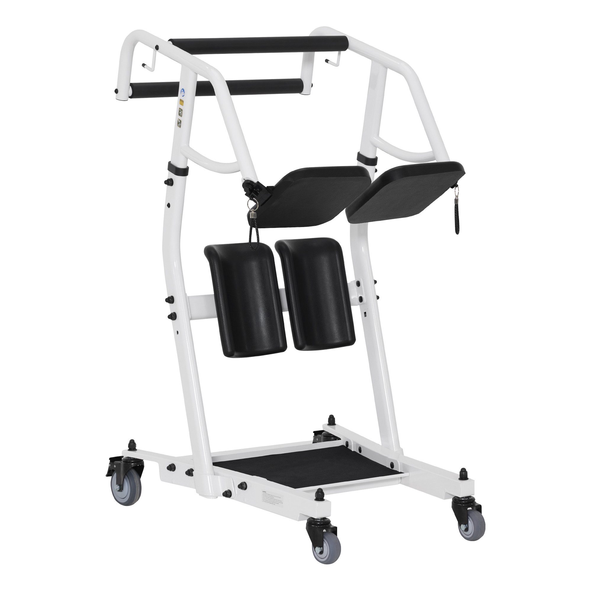 Erleben Sie die perfekte Kombination aus Sicherheit, Komfort und Mobilität mit unserem innovativen Patientenlifter. Dank seiner kompakten Breite von nur 64 cm und den 360° drehbaren Rollen gleitet er problemlos durch Türen und ist ideal für enge Räume. Die ergonomisch gestalteten Polster, höhenverstellbaren Knieauflagen und weichen Beinauflagen bieten ultimativen Komfort und eine gleichmäßige Unterstützung des Körpers. Mit einer maximalen Tragkraft von 180 kg und zuverlässigen Sicherheitsfunktionen, wie den vorderen Bremsrollen und dem rutschfesten Sitz. Ideal für den Einsatz zu Hause, im Krankenhaus oder Pflegeheim – für mehr Flexibilität und Würde in der Pflege. Ausführung: Mobilität und Würde: Das Hilfsmittel ermöglicht sicheres Aufstehen, fördert die Mobilität und entlastet das Pflegepersonal; ideal für Senioren und Patienten, die 60-70% ihres Körpergewichts beim Stehen tragen können, da dieser Patientenlifter mehr Würde als elektrische Hebehilfen bietet; perfekt für den Einsatz zu Hause, im Krankenhaus oder Pflegeheim Aufsteh- und Transferhilfe: Mit einer kompakten Breite von nur 64 cm und 360°drehbaren Rollen gleitet die Gehhilfe mühelos durch Türen; 17 cm hohe Bodenfreiheit erleichtert den Zugang zu Möbeln und ermöglicht einfachen Wechsel zwischen Pflegebett, Seniorensessel, Toilette und Rollstuhl; verfügt über einen Haken für Stützriemen (nicht enthalten), der das sichere Aufstehen unterstützt Zuverlässige Sicherheit: Die vorderen Rollen mit Bremsen verhindern unerwünschte Bewegungen des Transferstuhls, während das drehbare Sitzpolster mit Zugringverschluss Kippen verhindert; dank des robusten Stahlmaterials, präziser Schweißnähte und rutschfester Schrauben können Sie sich auf langanhaltenden Schutz und Sicherheit verlassen; maximale Tragkraft: 180 KG Komfort und Anpassung: Ergonomisch geneigte Sitzpolster, weich gepolsterte Beinauflagen, rutschfeste Fußstützen und komfortable Schaumstoffgriffe sorgen für gleichmäßige Unterstützung und Komfort des Körpers; 9 cm höhenverstellbaren Kniepolster der Aufstehhilfe passen sich unterschiedlichen Körpergrößen an; empfohlene Körpergröße: 152-190 CM Wichtige Hinweise: Bitte vor dem Kauf die Maße prüfen; mit benötigten Werkzeugen und detaillierten Anleitung ist die Montageanleitung einfach; bei Fragen stehen wir innerhalb von 24 Stunden zur Verfügung Technische Daten Typ: 6360-STA446BK/STA447BK Farbe: Schwarz Material: Stahl Gesamtabmessung: 86cm (T) x 64cm (B) x 118,5cm (H) Einstellhöhe des Knieschoners: 9 cm Höhe des Sitzpolsters: 72,5 cm Knieschonergröße: 29 cm (T) x 7,5 cm (B) Sitzpolstergröße: 28 cm (T) x 23 cm (B) Размер der Basisplatte:38 cm (T) ×48 cm (B) Durchmesser vorderer Rolle:7,5 cm Durchmesser hinterer Rolle:10,2 cm Produktgewicht: 28 kg Max. Belastbarkeit: 180 kg Lieferung: 1 Packung