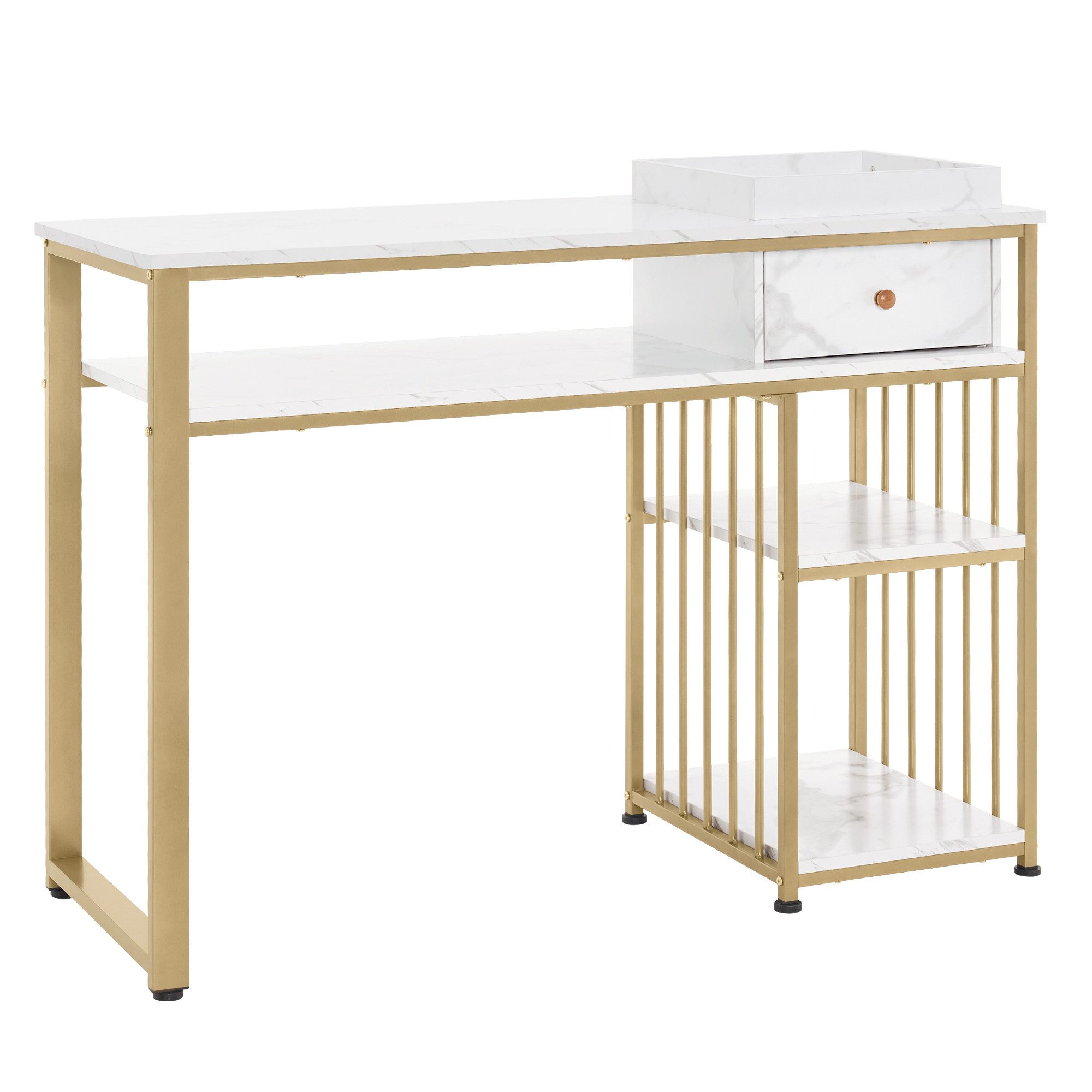 MCombo Schreibtisch mit Schublade und Regal Eine atemberaubende Kombination aus Vintage-Eleganz und dezentem Luxus Marmor trifft Gold: zeitlose Eleganz und luxuriöses Flair. Das simple Designkonzept, feine und exquisite Verarbeitung, ist nicht nur ein Möbel, sondern auch ein leichtes Luxuskunstwerk mit modischem Charme und Verlockung, das Ihnen ein wunderbares Lebensvergnügen beschert. Ausführung: Stilvolles Design: Marmorierte Tischplatte, champagnergold lackiertes Stahlrohr und Holzgriffe, das Vintage-Design erinnert an das mittelalterliche Europa; kombiniert mit anderen Dekorationsgegenständen verleiht der Schminktisch Ihrer Wohnung eine elegante Note Reichlicher Stauraum: Der Nageltisch verfügt über 1 Extra-Stauraum(33x33x5 cm), 1 Schublade (29x27,5x10,5 cm), 3 offene Ablagen bietet den Nageldesigner den ausreichenden Arbeitsplatz; sämtliche Arbeitsmaterialien werden ordentlich verstaut Solide Konstruktion: Eine 15 mm starke MDF-Tischplatte, die von mehreren Stahlrohren getragen wird, sorgt für Langlebigkeit und Stabilität; der Schreibtisch kann bis zu 75 kg belasten; höhenverstellbare Bodenschoner können Bodenunebenheiten ausgleichen Mehrzweck Verwendung: Der Tisch lässt sich als Schreibtisch oder Computertisch im Wohnzimmer, als Manikürtisch im Schönheitssalon oder Nagelstudio verwenden, oder mit Spiegel zum perfekten Schminktisch im Schlafzimmer kombinieren; der Tisch macht sich mit Sicherheit hervorragend in jeder Umgebung Leicht zu Renigen: Dank der glatten Oberfläche ist der Schminktisch feuchtigkeitsbeständig und schmutzabweisend; Schmutz und Flecken können mit einem nassen Tuch von dem Computertisch leicht entfernt werden Einfache Montage: ① Der Nagelfrisiertisch wird in 1 Packung gepackt ② Die Montageanleitung mit nummerierten Zubehörteilen, ausführlichen Schritten und die im Paket enthaltenen Werkzeuge machen die Montage mühelos Technische Daten Typ: 6090-2498WG Farbe: Weiß/ Gold Material der Tischplatte: MDF Material des Gestells: Metall Gesamtmaße: 45 cm(T) x 110 cm(B) x 80.5 cm(H) Размер der Schublade: 29 cm(T) x 27,5 cm(B) x 10,5 cm(H) Размер jeder Ablage: 43 cm(T) x 30 cm(B) Tischplatte Stärke: 1,5 cm Max. Belastbarkeit: 75 kg Gewicht: 21 kg Lieferung: 1 Packung