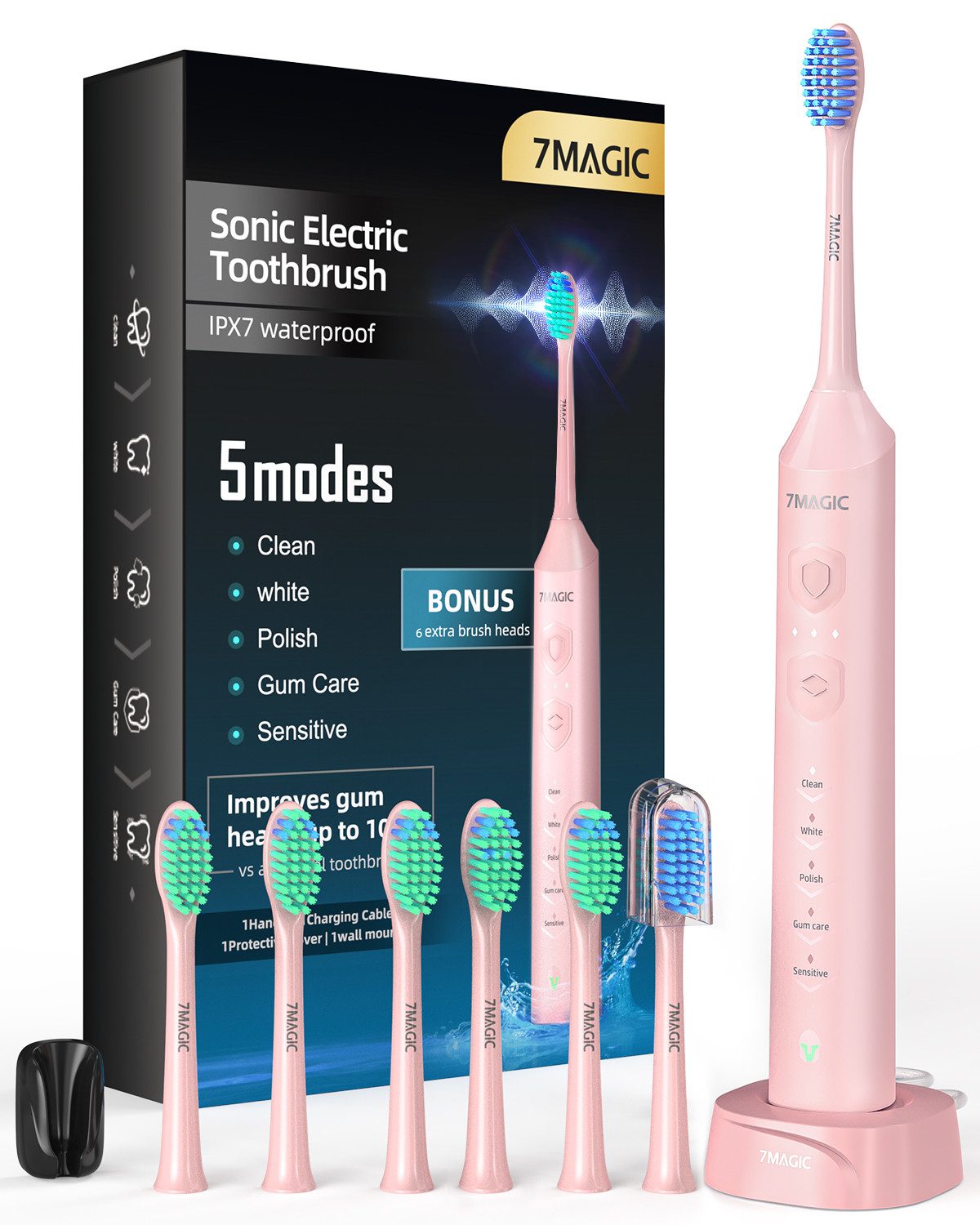 Lieferumfang | 1 Elektrische Zahnbürste 6 Ersatzbürstenköpfe 1 kabellose Ladestation 1 Wandhalterung 1 Bedienungsanleitung |