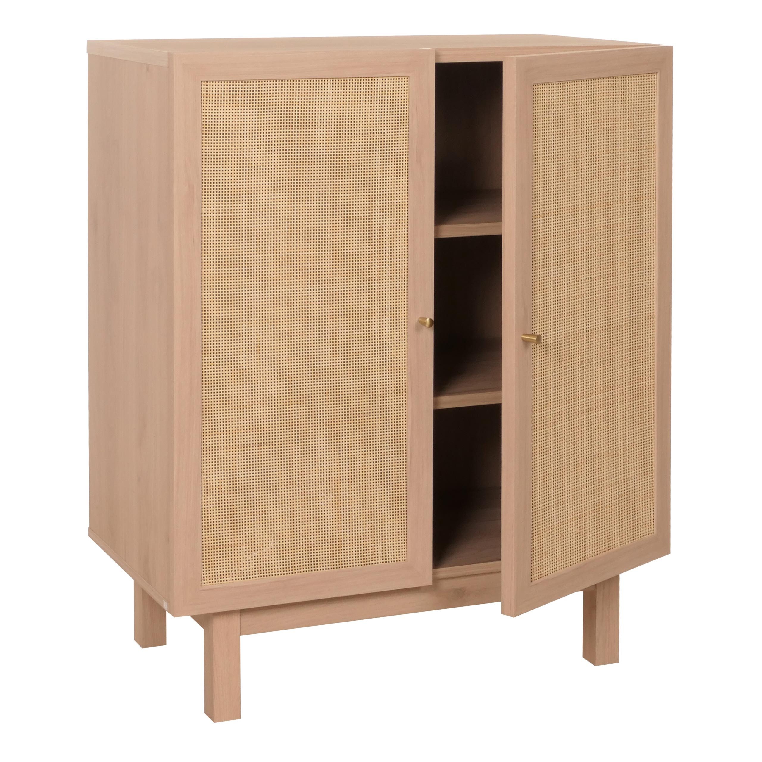 Material | Korpus/Füße: Spanplatte aus Mangoholz, MDF aus Gummiholz, Türfront: Kubu Rattan, Griffe/Scharniere: Eisen |