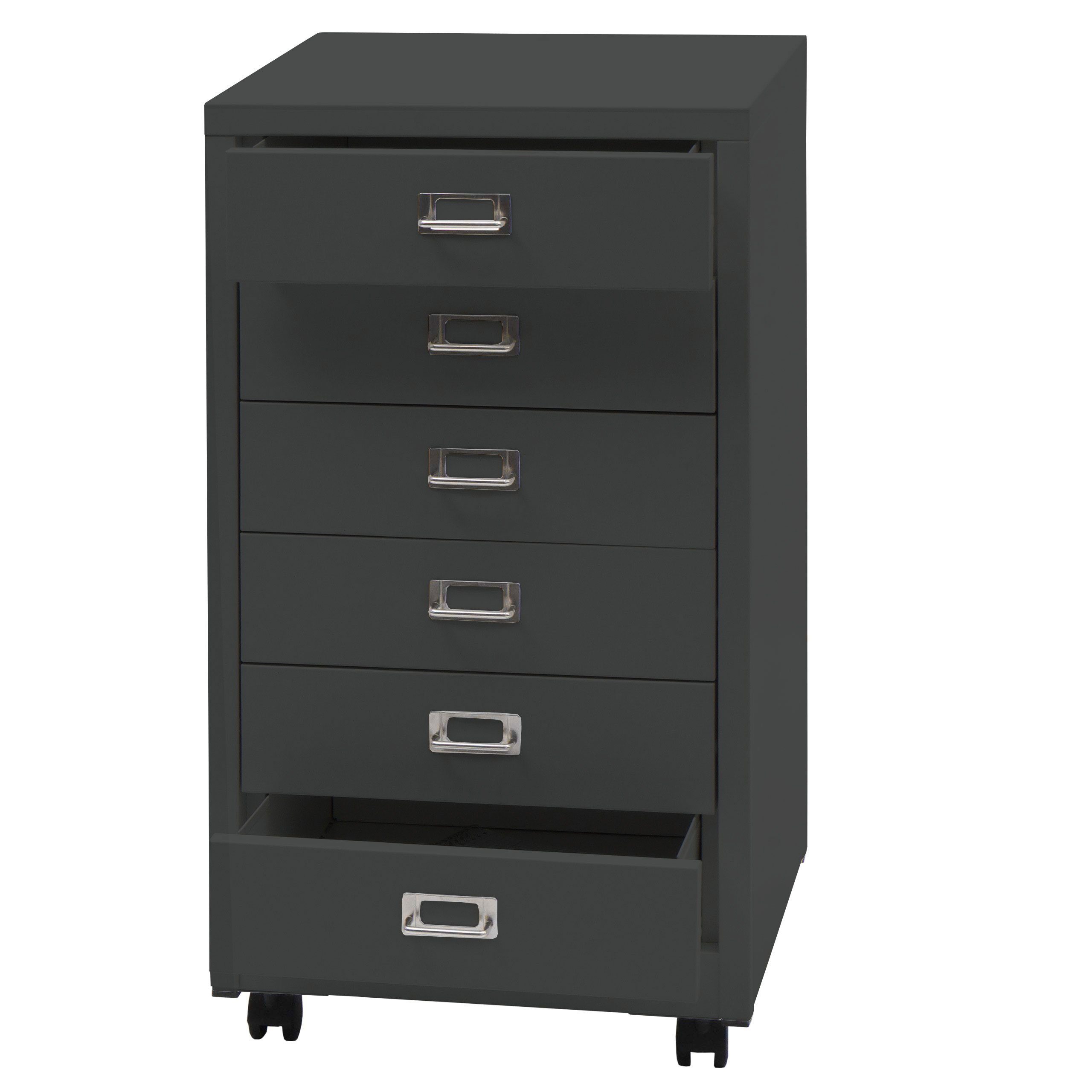 - Dieser schlichte Bürocontainer darf in Ihrem Arbeitszimmer nicht fehlen. Die sechs Schubladen aus Stahl bieten ausreichend Platz für beispielsweise Büroutensilien, Computerzubehör und Dokumente, die nichts auf Ihrem Schreibtisch zu suchen haben. - Durch diesen praktischen Rollschrank schaffen Sie Ordnung und können sich voll und ganz auf Ihre Arbeit konzentrieren. Zudem ist dieser Schrank mit vier Laufrollen ausgestattet, wodurch er sich je nach Ihren Räumlichkeiten ganz einfach integrieren lässt.