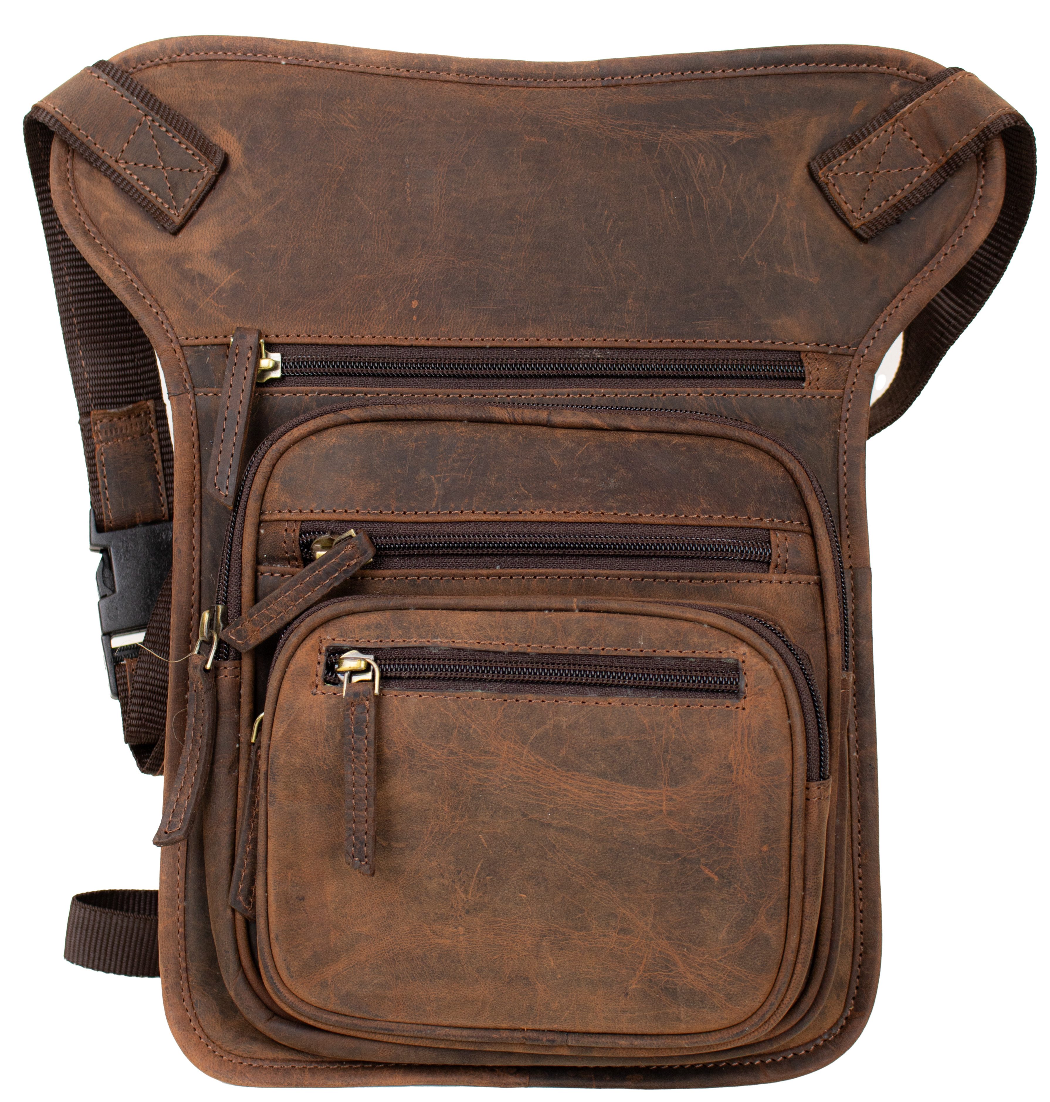 Robuste Beintasche aus echtem Rindsleder in Schwarz, Braun und Cognac. Mit mehreren Reißverschlussfächern, verstellbarem Gurt und abnehmbarer Beinschlaufe bietet sie maximalen Tragekomfort. Ideal für Motorrad, Reisen und Festivals – stilvoll, praktisch und sicher.