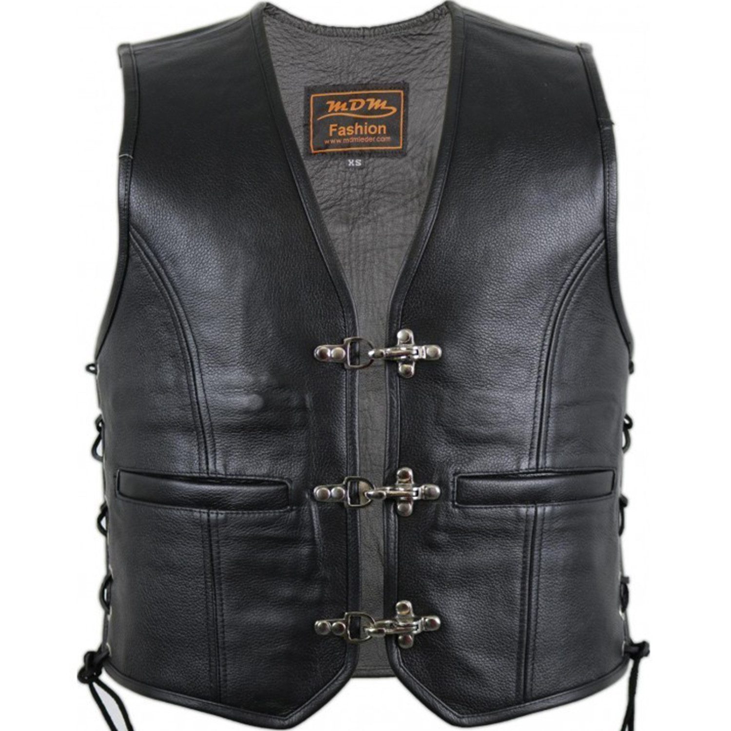 Diese hochwertige Motorradweste aus echtem, robustem Rindsleder bietet sowohl Stil als auch Funktionalität. Die Weste ist aus einem besonders langlebigen Leder gefertigt, das eine Dicke von ca. 1,1 bis 1,2 mm aufweist und so optimalen Schutz bei Fahrten bietet. Der tiefschwarze Farbton und die stilvolle Lederumrandung verleihen der Weste einen markanten, klassischen Look. Für eine perfekte Passform ist die Weste an beiden Seiten geschnürt, sodass sie bequem über einer Jacke getragen werden kann. Sie ist mit drei verchromten Schnallen ausgestattet, die als Verschluss dienen und die Weste sicher und einfach verschließen lassen. Die praktische Gestaltung umfasst zwei Außentaschen, die ausreichend Stauraum für kleinere Gegenstände bieten. Im Inneren finden sich zwei tiefe Innentaschen, die beide mit einem robusten Reißverschluss ausgestattet sind und zusätzlichen Platz für Wertsachen oder persönliche Utensilien bieten. Das Innenfutter der Weste besteht ebenfalls aus echtem Rindsleder, was für eine angenehme Tragequalität sorgt und den exklusiven Look der Weste unterstreicht. Ideal für Motorradfahrer, die sowohl auf der Suche nach einer funktionellen als auch stilvollen Ergänzung ihrer Motorradkleidung sind.