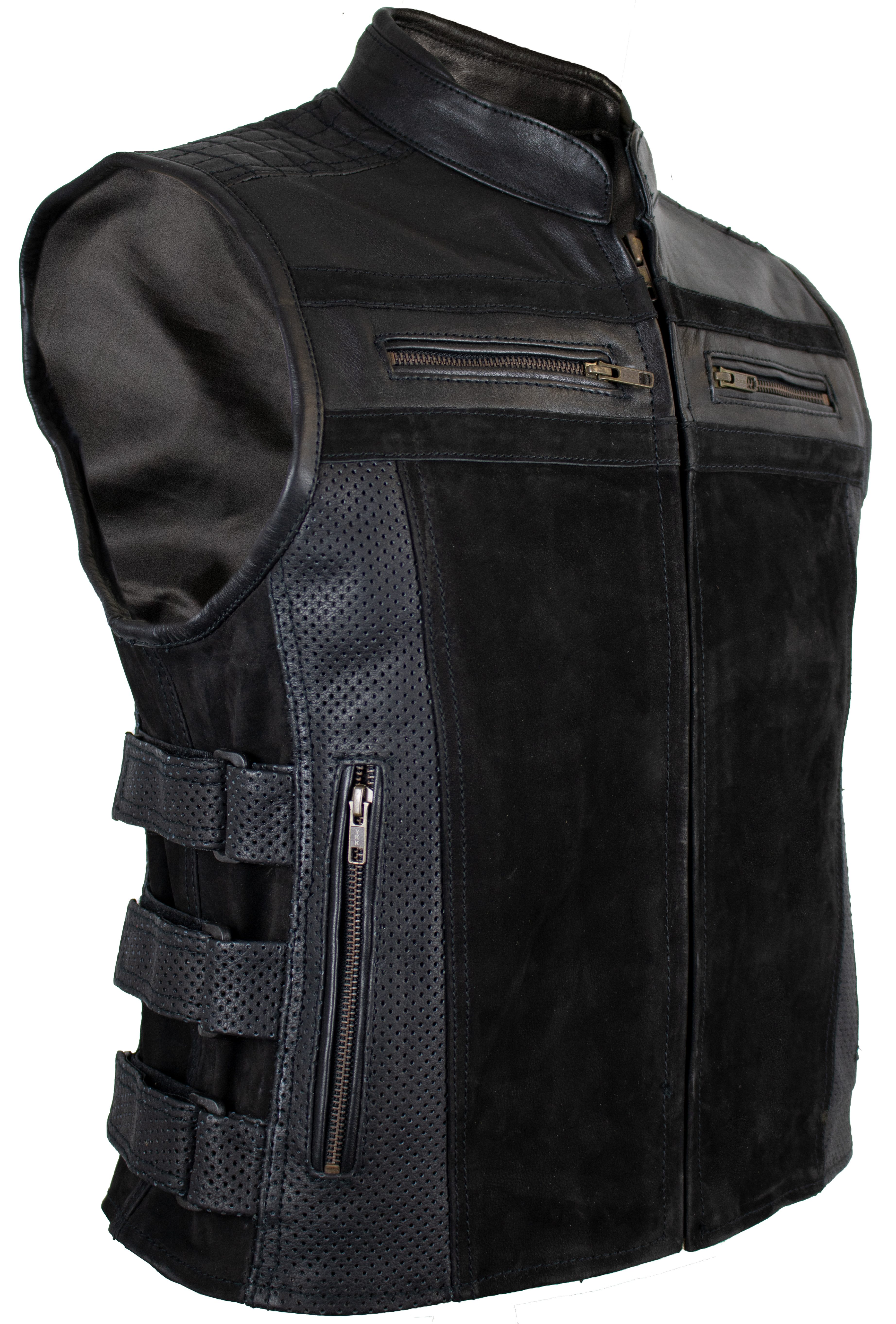rlebe Stil, Komfort und Funktionalität mit unserer hochwertigen Biker Motorrad Lederweste. Diese Weste wurde speziell für anspruchsvolle Biker entwickelt und überzeugt durch ihr durchdachtes Design und ihre exzellente Materialqualität. Material & Verarbeitung: Der untere Teil der Weste besteht aus strapazierfähigem Nubuk-Büffelleder, das für seine robuste Struktur bekannt ist. Der obere Teil ist aus geschmeidigem Rinds-Nappaleder gefertigt, das für eine weiche Haptik und gleichzeitig hohe Widerstandsfähigkeit sorgt. Mit einer Lederdicke von 1,1 bis 1,2 mm ist die Weste angenehm leicht und dennoch extrem widerstandsfähig. Design & Komfort: Das dicke, aber weiche Leder bietet optimalen Tragekomfort und einen klassischen, zeitlosen Look in elegantem Schwarz. Das Innenfutter aus einem Baumwollgemisch sorgt für ein angenehmes Hautgefühl, selbst bei längeren Fahrten. Praktische Details: Vier Außentaschen mit Reißverschluss bieten sicheren Stauraum für alles Wichtige, das schnell zur Hand sein muss. Zwei Innentaschen, davon eine mit Reißverschluss, bieten zusätzlichen Platz für persönliche Gegenstände wie Geldbörse oder Handy. Unter dem Hauptreißverschluss sorgt ein zusätzlich eingenähtes Lederstück dafür, dass die Weste winddicht ist – ideal für Fahrten bei kühleren Temperaturen. Anpassbarkeit: Dank der seitlichen Klettverschlüsse ist die Weste individuell verstellbar und bietet eine perfekte Passform für jeden Biker. Ideal für Patches: Die Weste wurde speziell dafür designt, deine persönlichen Patches optimal zur Geltung zu bringen und sie zu einem unverwechselbaren Begleiter zu machen. Diese Biker Motorrad Lederweste vereint klassische Ästhetik mit moderner Funktionalität. Perfekt für leidenschaftliche Biker, die nicht nur Wert auf Stil, sondern auch auf Praktikabilität legen.